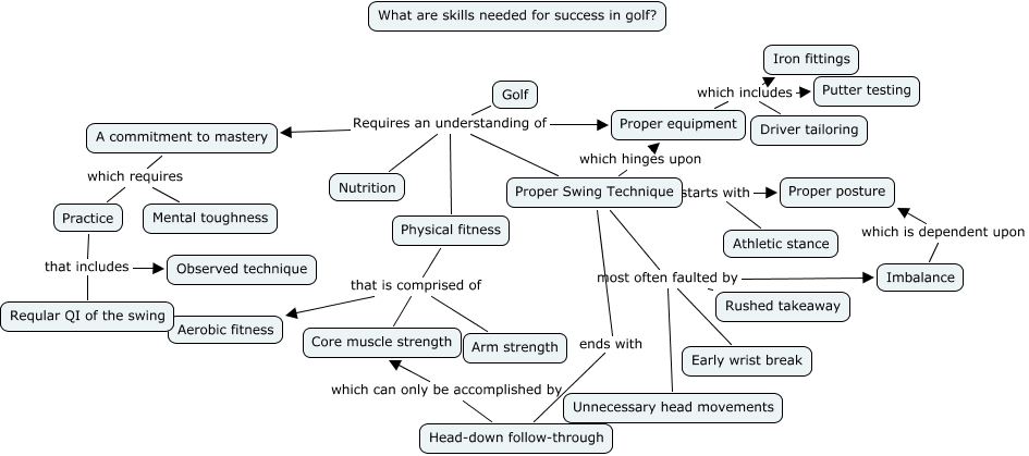 This Concept Map, created with IHMC CmapTools, has information related to: Golf hobby map_retreat_Kamal, Proper equipment which includes Putter testing, Golf Requires an understanding of A commitment to mastery, Proper Swing Technique most often faulted by Early wrist break, Physical fitness that is comprised of Aerobic fitness, Proper Swing Technique most often faulted by Unnecessary head movements, Practice that includes Reqular QI of the swing, Proper Swing Technique starts with Athletic stance, Imbalance which is dependent upon Proper posture, A commitment to mastery which requires Practice, Practice that includes Observed technique, Golf Requires an understanding of Nutrition, Golf Requires an understanding of Proper equipment, Physical fitness that is comprised of Arm strength, Physical fitness that is comprised of Core muscle strength, Golf Requires an understanding of Physical fitness, Proper Swing Technique ends with Head-down follow-through, Golf Requires an understanding of Proper Swing Technique, Head-down follow-through which can only be accomplished by Core muscle strength, Proper Swing Technique which hinges upon Proper equipment, Proper equipment which includes Driver tailoring