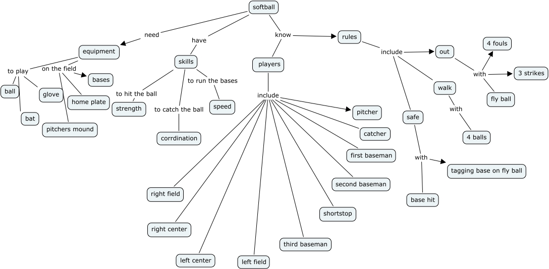 This Concept Map, created with IHMC CmapTools, has information related to: hobby - softball, players include pitcher, equipment on the field bases, walk with 4 balls, skills to run the bases speed, equipment to play bat, equipment on the field pitchers mound, softball need equipment, players include left center, skills to hit the ball strength, players include first baseman, softball know players, rules include safe, players include left field, players include right field, players include second baseman, players include right center, softball have skills, players include shortstop, out with fly ball, equipment to play glove