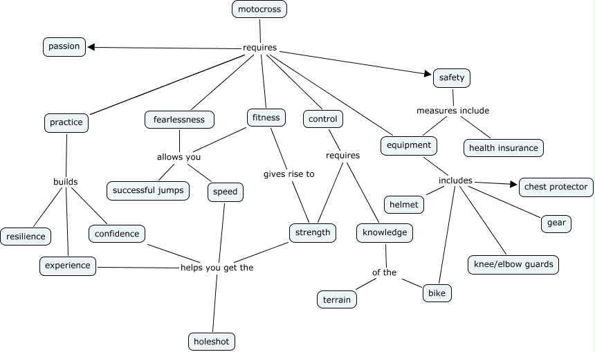 This Concept Map, created with IHMC CmapTools, has information related to: motocross heath, fearlessness allows you speed, knowledge of the terrain, practice builds confidence, safety measures include equipment, fitness gives rise to strength, practice builds experience, speed helps you get the holeshot, strength helps you get the holeshot, motocross requires practice, fearlessness allows you successful jumps, fitness allows you speed, control requires strength, equipment includes chest protector, motocross requires practice, motocross requires control, motocross requires fearlessness, equipment includes helmet, experience helps you get the holeshot, safety measures include health insurance, equipment includes bike