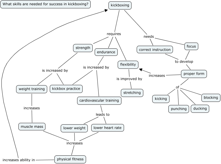 This Concept Map, created with IHMC CmapTools, has information related to: Himburg_hobbymap, proper form increases flexibility, flexibility is improved by stretching, correct instruction to develop proper form, proper form of punching, weight training increases muscle mass, cardiovascular training leads to lower heart rate, endurance is increased by kickbox practice, physical fitness increases ability in kickboxing, strength is increased by kickbox practice, proper form of kicking, proper form of blocking, kickboxing requires endurance, lower heart rate increases physical fitness, cardiovascular training leads to lower weight, kickboxing requires flexibility, kickboxing needs correct instruction, strength is increased by weight training, proper form of ducking, kickboxing needs focus, lower weight increases physical fitness