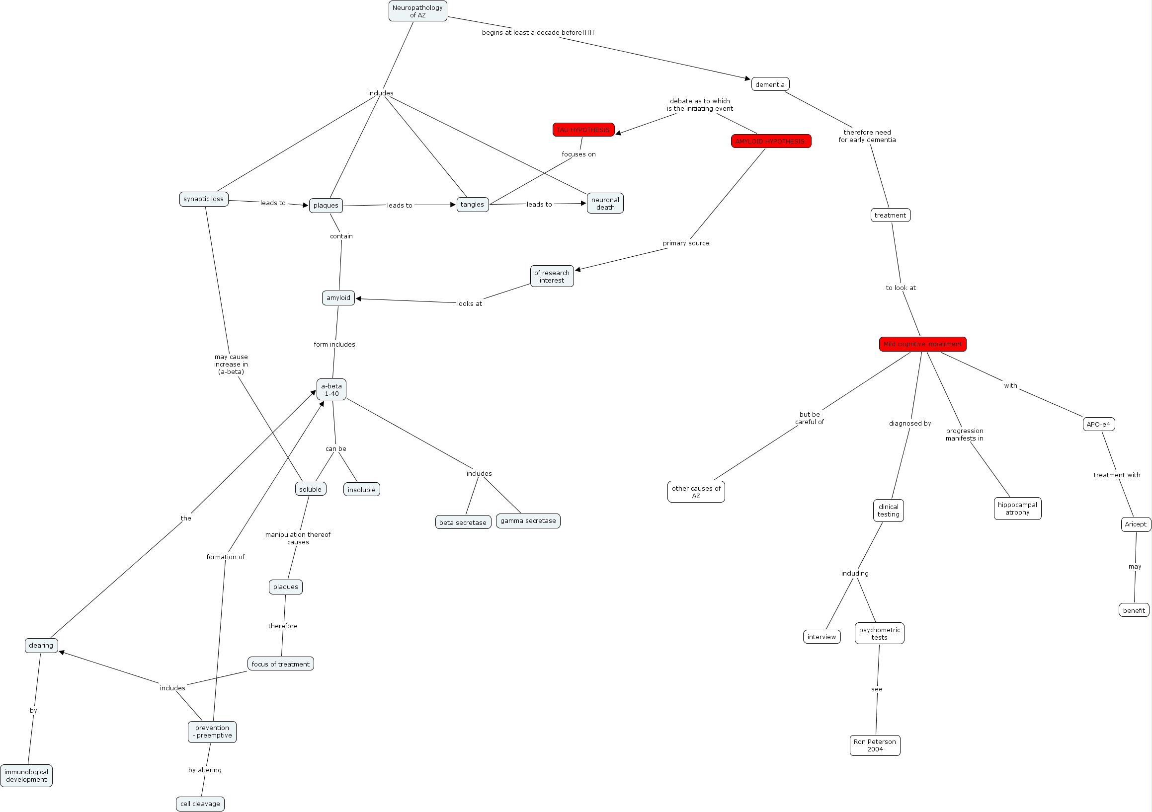 AZ neuropathology, AMYLOID HYPOTHESIS: debate as to which is the initiating event TAU HYPOTHESIS, focus of treatment includes clearing, clinical testing including psychometric tests, focus of treatment includes prevention - preemptive, treatment to look at Mild cognitive impairment, Mild cognitive impairment with APO-e4, plaques therefore focus of treatment, prevention - preemptive formation of a-beta 1-40, Mild cognitive impairment diagnosed by clinical testing, clinical testing including interview