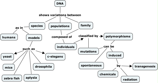 Cognition - DNA, JDN Rev, individuals classified by polymorphisms, models such as yeast, populations composed of individuals, models such as mice, models such as zebra fish, induced by radiation, models such as drosophila, individuals classified by mutations, DNA shows variations between family, species as in models