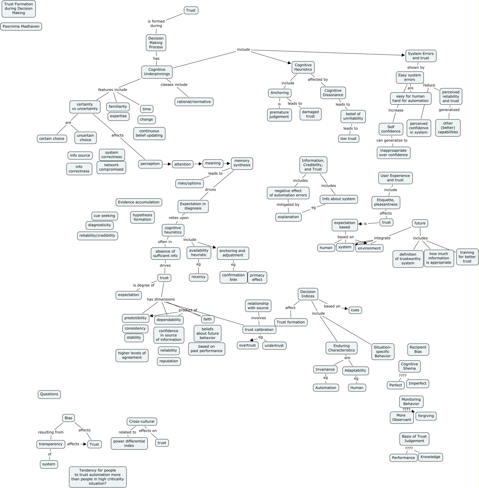 This Concept Map, created with IHMC CmapTools, has information related to: Madhaven - lkb, Cross-cultural related to power differential index, Information, Credibility, and Trust includes Info about system, trust calibration has dimensions dependability, trust has dimensions dependability, Invariance eg Automation, future integrate system, Decision Indices include Enduring Characteristics, anchoring and adjustment eg confirmation bias, faith product of predictibility, perception attention, Cognitive Underpinnings features include certainty vs uncertainty, future integrate human, Enduring Characteristics are Adaptability, Monitoring Behavior ???? More Observant, Etiquette, pleasantness affects trust, trust calibration eg overtrust, trust calibration eg undertrust, expectation based based on system, certainty vs uncertainty are uncertain choice, Anchoring leads to damaged trust