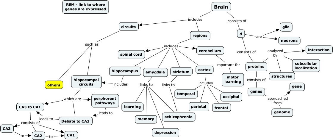 brain JDN Revision, CA3 to CA1 consists of CA1, genes approached from gene, proteins analyzed by subcellular localization, hippocampal circuits which are Debate to CA3, CA2 to CA1, Brain consists of d, d consists of proteins, d are glia, amygdala links to depression, regions includes cortex