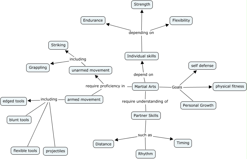 This Concept Map, created with IHMC CmapTools, has information related to: TKMA, armed movement including edged tools, Martial Arts Goals Personal Growth, unarmed movement including Striking, Martial Arts require understanding of Partner Skills, Martial Arts Goals physical fitness, Partner Skills such as Rhythm, armed movement including flexible tools, armed movement including blunt tools, Martial Arts Goals self defense, Partner Skills such as Distance, Martial Arts require proficiency in armed movement, Individual skills depending on Flexibility, Martial Arts depend on Individual skills, unarmed movement including Grappling, Martial Arts require proficiency in unarmed movement, Individual skills depending on Endurance, Individual skills depending on Strength, Partner Skills such as Timing, armed movement including projectiles