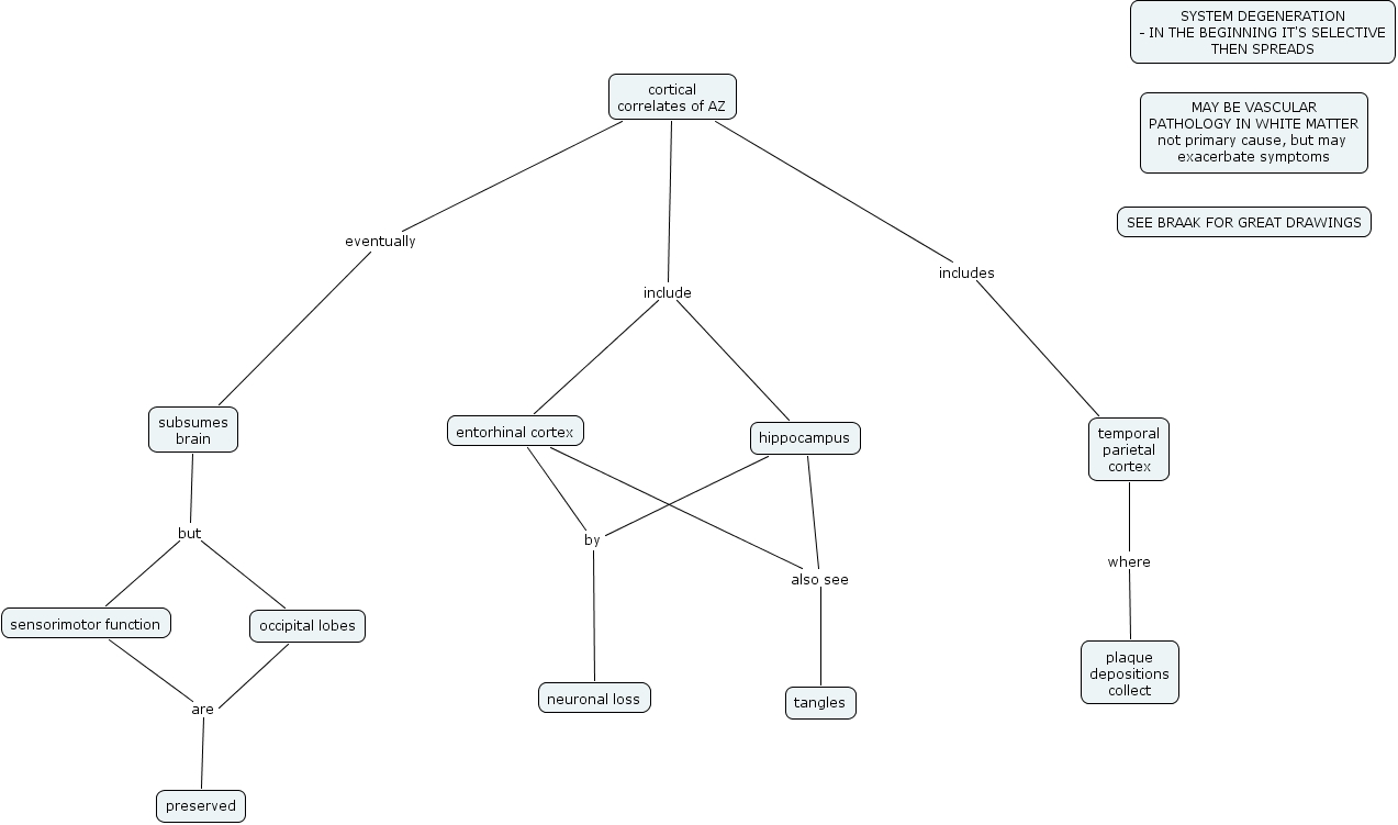 AZ Cortex, temporal parietal cortex where plaque depositions collect, subsumes brain but occipital lobes, entorhinal cortex by neuronal loss, cortical correlates of AZ include entorhinal cortex, cortical correlates of AZ include hippocampus, cortical correlates of AZ include hippocampus, cortical correlates of AZ include entorhinal cortex, entorhinal cortex also see tangles, hippocampus also see tangles, cortical correlates of AZ eventually subsumes brain