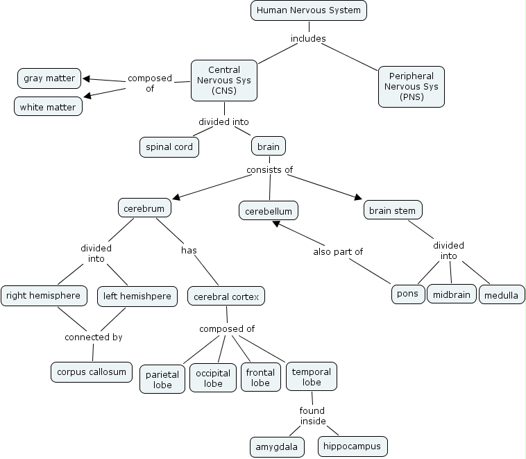 Human Nervous System, brain stem divided into medulla, cerebral cortex composed of frontal lobe, pons also part of cerebellum, cerebral cortex composed of occipital lobe, brain consists of cerebrum, cerebral cortex composed of temporal lobe, Human Nervous System includes Central Nervous Sys (CNS), brain stem divided into pons, temporal lobe found inside hippocampus, Human Nervous System includes Peripheral Nervous Sys (PNS)