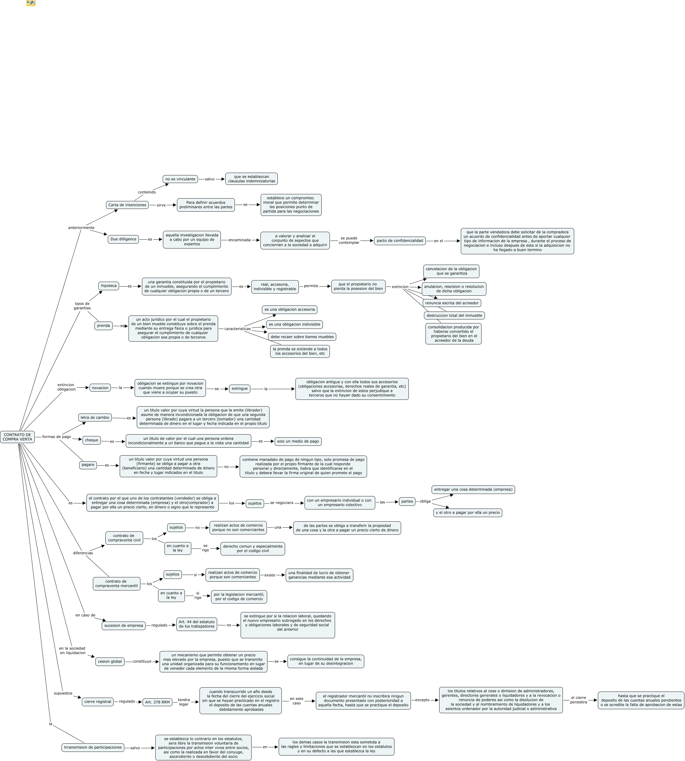 Aquest mapa conceptual conté informació relacionada amb: Mapa conceptual 2, CONTRATO DE COMPRA VENTA supuestos cierre registral, pagare es un titulo valor por cuya virtud una persona (firmante) se obliga a pagar a otra (beneficiario) una cantidad determinada de dinero en fecha y lugar indicados en el titulo, un acto juridico por el cual el propietario de un bien mueble constituye sobre el prenda mediante su entrega fisica o juridica para asegurar el cumplimiento de cualquier obligacion sea propia o de terceros caracteristicas es una obligacion accesoria, CONTRATO DE COMPRA VENTA formas de pago pagare, los titulos relativos al cese o dimision de administradores, gerentes, directores generales o liquidadores y a la revocacion o renuncia de poderes asi como la disolucion de la sociedad y al nombramiento de liquidadores y a los asientos ordenador por la autoridad judicial o administrativa el cierre persistira hasta que se practique el deposito de las cuentas anuales pendientes o se acredite la falta de aprobacion de estas, CONTRATO DE COMPRA VENTA anteriormente Due dilligence, sujetos si realizan actos de comercio porque son comerciantes, con un empresario individual o con un empresario colectivo las partes, contrato de compraventa mercantil los sujetos, cuando transcurrido un año desde la fecha del cierre del ejercicio social sin que se hayan practicado en el registro el deposito de las cuentas anuales debidamente aprobadas en este caso el registrador mercantil no inscribira ningun documento presentado con posterioridad a aquella fecha, hasta que se practique el deposito, Art. 378 RRM tendra legar cuando transcurrido un año desde la fecha del cierre del ejercicio social sin que se hayan practicado en el registro el deposito de las cuentas anuales debidamente aprobadas, en cuanto a la ley si rige por la legislacion mercantil, por el codigo de comercio, pacto de confidencialidad en el que la parte vendedora debe solicitar de la compradora un acuerdo de confidencialidad antes de aportar cualquier tipo de informacion de la empresa , durante el proceso de negociacion e incluso despues de esta si la adquisicion no ha llegado a buen termino, un mecanismo que permite obtener un precio mas elevado por la empresa, puesto que se transmite una unidad organizada para su funcionamiento en lugar de veneder cada elemento de la misma forma aislada se consigue la continuidad de la empresa, en lugar de su desintegracion, CONTRATO DE COMPRA VENTA diferencias contrato de compraventa mercantil, trransmision de participaciones salvo se establezca lo contrario en los estatutos, sera libre la transmision voluntaria de participaciones por actos inter vivos entre socios, asi como la realizada en favor del conyuge, ascendiente o descebdiente del socio, Carta de intenciones sirve Para definir acuerdos preliminares entre las partes, Due dilligence es aquella investigacion llevada a cabo por un equipo de expertos, Para definir acuerdos preliminares entre las partes se establece un compromiso moral que permite determinar las posiciones punto de partida para las negociaciones, letra de cambio es un titulo valor por cuya virtud la persona que la emite (librador) asume de manera incondicionada la obligacion de que una segunda persona (librado) pagara a un tercero (tomador) una cantidad determinada de dinero en el lugar y fecha indicada en el propio titulo