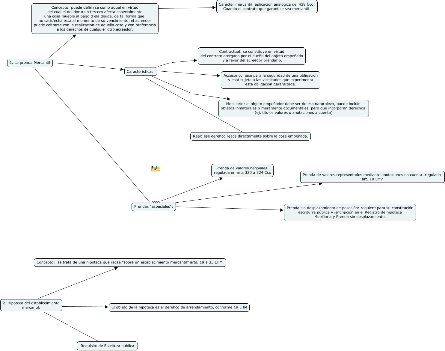 Este Cmap, tiene información relacionada con: Garanties reals, Concepto: puede definirse como aquel en virtud del cual el deudor o un tercero afecta especialmente una cosa mueble al pago d ela deuda, de tal forma que, no satisfecha ésta al momento de su vencimiento, el acreedor puede cobrarse con la realización de aquella cosa y con preferencia a los derechos de cualquier otro acreedor. ???? Cáracter mercantil, aplicación analógica del 439 Cco: Cuando el contrato que garantice sea mercantil., Prendas "especiales": ???? Prenda sin desplazamiento de posesión: requiere para su constitución escriturra pública y isncripción en el Registro de hipoteca Mobiliaria y Prenda sin desplazamiento., 2. Hipoteca del establecimiento mercantil. ???? Concepto: se trata de una hipoteca que recae "sobre un establecimiento mercantil" arts. 19 a 33 LHM., Características: Mobiliario: el objeto empeñador debe ser de esa naturaleza, puede incluir objetos inmaterales o meramente documentales, pero que incorporan derechos (ej. titulos valores o anotaciones a cuenta), 1. La prenda Mercantil Concepto: puede definirse como aquel en virtud del cual el deudor o un tercero afecta especialmente una cosa mueble al pago d ela deuda, de tal forma que, no satisfecha ésta al momento de su vencimiento, el acreedor puede cobrarse con la realización de aquella cosa y con preferencia a los derechos de cualquier otro acreedor., Prendas "especiales": ???? Prenda de valores negoiales: regulada en arts 320 a 324 Cco, Características: Real: ese derehco reace directamente sobre la cosa empeñada., 1. La prenda Mercantil Prendas "especiales":, Características: ???? Accesorio: nace para la seguridad de una obligación y está sujeta a las vicisitudes que experimenta esta obligación garantizada., 2. Hipoteca del establecimiento mercantil. Requisito de Escritura pública, 2. Hipoteca del establecimiento mercantil. ???? El objeto de la hipoteca es el derehco de arrendamiento, conforme 19 LHM, 1. La prenda Mercantil ???? Características:, Prendas "especiales": Prenda de valores representados mediante anotaciones en cuenta: regulada art. 10 LMV, Características: Contractual: se constituye en virtud del contrato otorgado por el dueño del objeto empeñado y a favor del acreedor prendario.