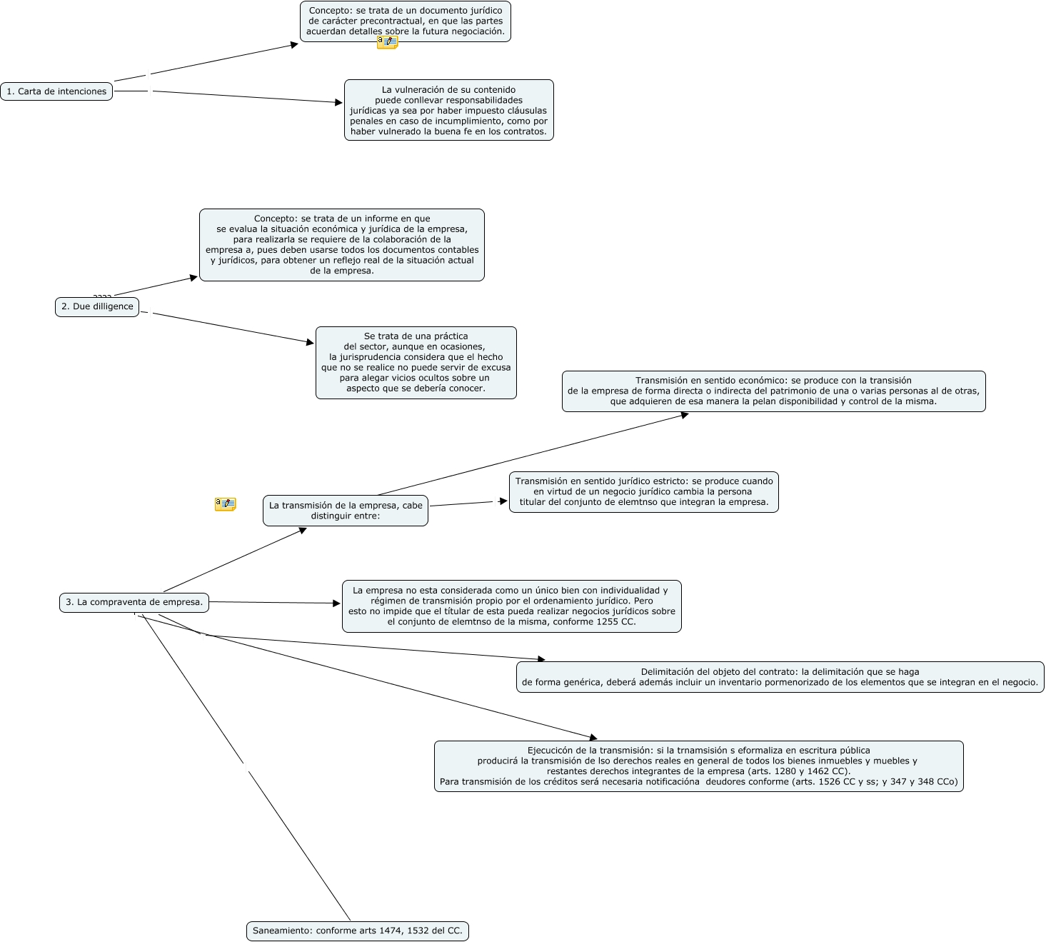 Este Cmap, tiene información relacionada con: Contracte de Compraventa d'empresa, 3. La compraventa de empresa. Saneamiento: conforme arts 1474, 1532 del CC., 2. Due dilligence Se trata de una práctica del sector, aunque en ocasiones, la jurisprudencia considera que el hecho que no se realice no puede servir de excusa para alegar vicios ocultos sobre un aspecto que se debería conocer., 2. Due dilligence ???? Concepto: se trata de un informe en que se evalua la situación económica y jurídica de la empresa, para realizarla se requiere de la colaboración de la empresa a, pues deben usarse todos los documentos contables y jurídicos, para obtener un reflejo real de la situación actual de la empresa., 3. La compraventa de empresa. ???? La empresa no esta considerada como un único bien con individualidad y régimen de transmisión propio por el ordenamiento jurídico. Pero esto no impide que el títular de esta pueda realizar negocios jurídicos sobre el conjunto de elemtnso de la misma, conforme 1255 CC., 1. Carta de intenciones Concepto: se trata de un documento jurídico de carácter precontractual, en que las partes acuerdan detalles sobre la futura negociación., 3. La compraventa de empresa. Delimitación del objeto del contrato: la delimitación que se haga de forma genérica, deberá además incluir un inventario pormenorizado de los elementos que se integran en el negocio., 3. La compraventa de empresa. Ejecucicón de la transmisión: si la trnamsisión s eformaliza en escritura pública producirá la transmisión de lso derechos reales en general de todos los bienes inmuebles y muebles y restantes derechos integrantes de la empresa (arts. 1280 y 1462 CC). Para transmisión de los créditos será necesaria notificacióna deudores conforme (arts. 1526 CC y ss; y 347 y 348 CCo), La transmisión de la empresa, cabe distinguir entre: Transmisión en sentido jurídico estricto: se produce cuando en virtud de un negocio jurídico cambia la persona titular del conjunto de elemtnso que integran la empresa., 3. La compraventa de empresa. La transmisión de la empresa, cabe distinguir entre:, La transmisión de la empresa, cabe distinguir entre: ???? Transmisión en sentido económico: se produce con la transisión de la empresa de forma directa o indirecta del patrimonio de una o varias personas al de otras, que adquieren de esa manera la pelan disponibilidad y control de la misma., 1. Carta de intenciones La vulneración de su contenido puede conllevar responsabilidades jurídicas ya sea por haber impuesto cláusulas penales en caso de incumplimiento, como por haber vulnerado la buena fe en los contratos.