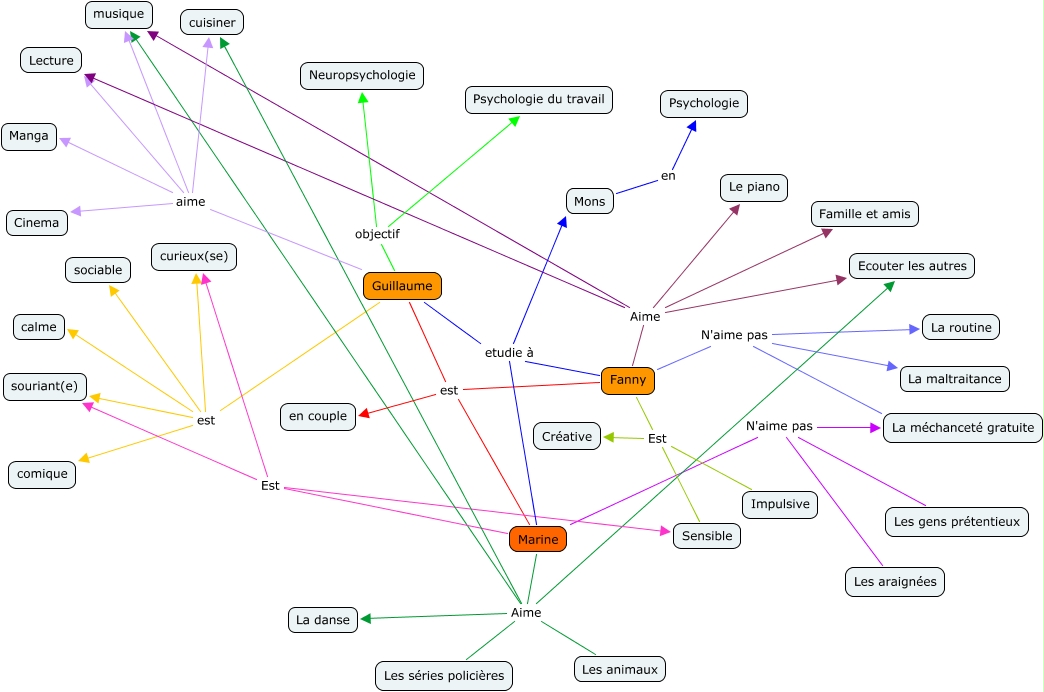 Cette carte de concepts créée avec IHMC CmapTools traite de: carte equipe_M_M48, Guillaume etudie à Mons, Guillaume aime cuisiner, Fanny etudie à Mons, Marine Aime Les animaux, Marine Est curieux(se), Guillaume est calme, Fanny Aime Lecture, Guillaume objectif Psychologie du travail, Fanny Aime Famille et amis, Fanny Est Sensible, Fanny Aime Ecouter les autres, Marine N'aime pas Les gens prétentieux, Fanny Est Créative, Fanny Aime Le piano, Fanny N'aime pas La méchanceté gratuite, Guillaume objectif Neuropsychologie, Guillaume aime Manga, Guillaume aime musique, Fanny Aime musique, Guillaume est sociable