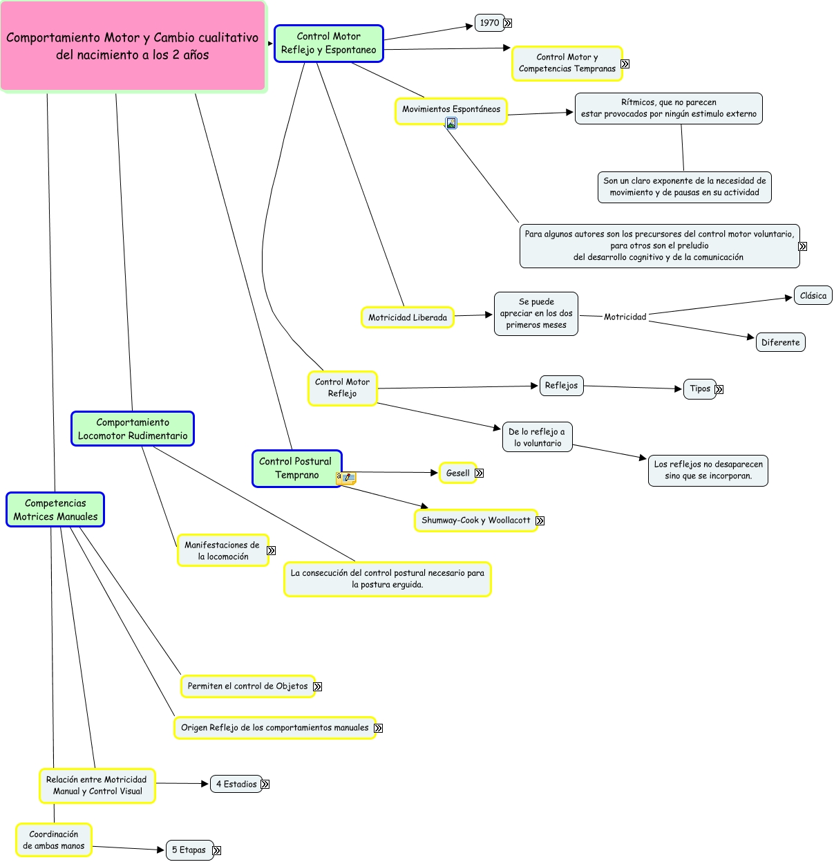 Este Cmap, tiene información relacionada con: Capitulo 2, Control Motor Reflejo ???? Reflejos, Comportamiento Locomotor Rudimentario ???? Manifestaciones de la locomoción, Motricidad Liberada ???? Se puede apreciar en los dos primeros meses, De lo reflejo a lo voluntario ???? Los reflejos no desaparecen sino que se incorporan., Comportamiento Locomotor Rudimentario ???? La consecución del control postural necesario para la postura erguida., Comportamiento Motor y Cambio cualitativo del nacimiento a los 2 años ???? Competencias Motrices Manuales, Control Motor Reflejo y Espontaneo ???? Control Motor y Competencias Tempranas, Control Motor Reflejo ???? De lo reflejo a lo voluntario, Control Postural Temprano ???? Shumway-Cook y Woollacott, Comportamiento Motor y Cambio cualitativo del nacimiento a los 2 años ???? Control Postural Temprano, Comportamiento Motor y Cambio cualitativo del nacimiento a los 2 años ???? Control Motor Reflejo y Espontaneo, Movimientos Espontáneos ???? Para algunos autores son los precursores del control motor voluntario, para otros son el preludio del desarrollo cognitivo y de la comunicación, Rítmicos, que no parecen estar provocados por ningún estimulo externo ???? Son un claro exponente de la necesidad de movimiento y de pausas en su actividad, Competencias Motrices Manuales ???? Permiten el control de Objetos, Relación entre Motricidad Manual y Control Visual ???? 4 Estadios, Control Motor Reflejo y Espontaneo ???? 1970, Cambios desarrollo muscular. Desarrollo neuromuscular que permita el equilibrio. Desarrollo del sistema vestibular, visual y somato-sensorial. Desarrollo represen. mentales. Desarrollo mecanismos de procesamiento de la información. Los niños aprendan a solucionar problemas motrices, Comportamiento Motor y Cambio cualitativo del nacimiento a los 2 años ???? Comportamiento Locomotor Rudimentario, Control Motor Reflejo y Espontaneo ???? Motricidad Liberada, Los niños aprendan a solucionar problemas motrices Mantener la estabilidad estática (con ayuda a los 8 meses). Cambiar de posición. Mantener equilibrio dinámico (anda sin ayuda a los 11 meses).