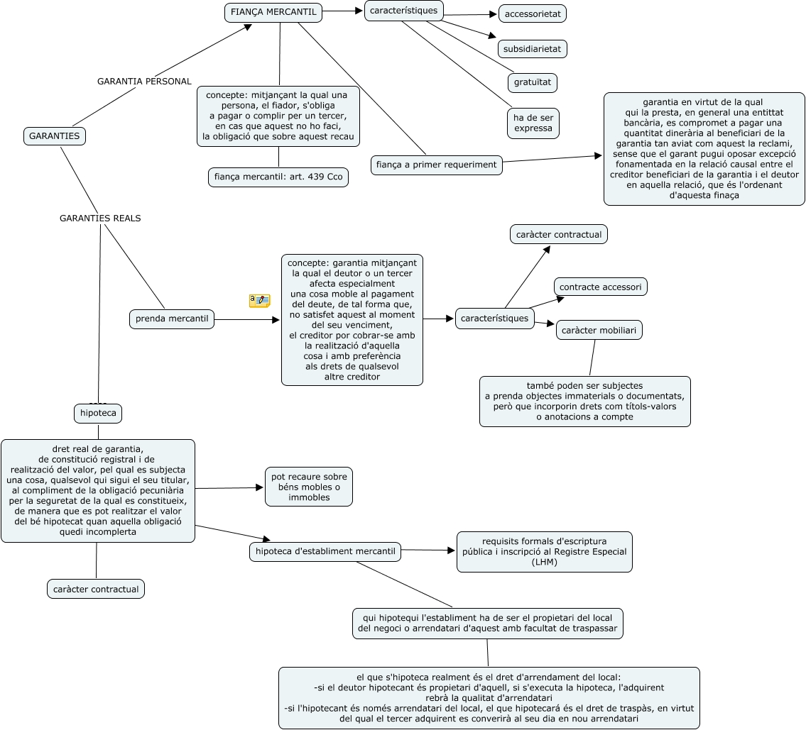 Este Cmap, tiene información relacionada con: escenari 2 garanties, característiques ???? subsidiarietat, caràcter mobiliari ???? també poden ser subjectes a prenda objectes immaterials o documentats, però que incorporin drets com títols-valors o anotacions a compte, característiques ???? accessorietat, hipoteca d'establiment mercantil ???? requisits formals d'escriptura pública i inscripció al Registre Especial (LHM), dret real de garantia, de constitució registral i de realització del valor, pel qual es subjecta una cosa, qualsevol qui sigui el seu titular, al compliment de la obligació pecuniària per la seguretat de la qual es constitueix, de manera que es pot realitzar el valor del bé hipotecat quan aquella obligació quedi incomplerta ???? hipoteca d'establiment mercantil, característiques ???? contracte accessori, FIANÇA MERCANTIL ???? concepte: mitjançant la qual una persona, el fiador, s'obliga a pagar o complir per un tercer, en cas que aquest no ho faci, la obligació que sobre aquest recau, GARANTIES GARANTIA PERSONAL FIANÇA MERCANTIL, GARANTIES GARANTIES REALS hipoteca, hipoteca d'establiment mercantil ???? qui hipotequi l'establiment ha de ser el propietari del local del negoci o arrendatari d'aquest amb facultat de traspassar, dret real de garantia, de constitució registral i de realització del valor, pel qual es subjecta una cosa, qualsevol qui sigui el seu titular, al compliment de la obligació pecuniària per la seguretat de la qual es constitueix, de manera que es pot realitzar el valor del bé hipotecat quan aquella obligació quedi incomplerta ???? caràcter contractual, hipoteca ???? ????, dret real de garantia, de constitució registral i de realització del valor, pel qual es subjecta una cosa, qualsevol qui sigui el seu titular, al compliment de la obligació pecuniària per la seguretat de la qual es constitueix, de manera que es pot realitzar el valor del bé hipotecat quan aquella obligació quedi incomplerta ???? pot recaure sobre béns mobles o immobles, concepte: mitjançant la qual una persona, el fiador, s'obliga a pagar o complir per un tercer, en cas que aquest no ho faci, la obligació que sobre aquest recau ???? fiança mercantil: art. 439 Cco, característiques ???? caràcter contractual, fiança a primer requeriment ???? garantia en virtut de la qual qui la presta, en general una entittat bancària, es compromet a pagar una quantitat dinerària al beneficiari de la garantia tan aviat com aquest la reclami, sense que el garant pugui oposar excepció fonamentada en la relació causal entre el creditor beneficiari de la garantia i el deutor en aquella relació, que és l'ordenant d'aquesta finaça, hipoteca concepte dret real de garantia, de constitució registral i de realització del valor, pel qual es subjecta una cosa, qualsevol qui sigui el seu titular, al compliment de la obligació pecuniària per la seguretat de la qual es constitueix, de manera que es pot realitzar el valor del bé hipotecat quan aquella obligació quedi incomplerta, FIANÇA MERCANTIL ???? fiança a primer requeriment, característiques ???? gratuïtat, característiques ???? caràcter mobiliari