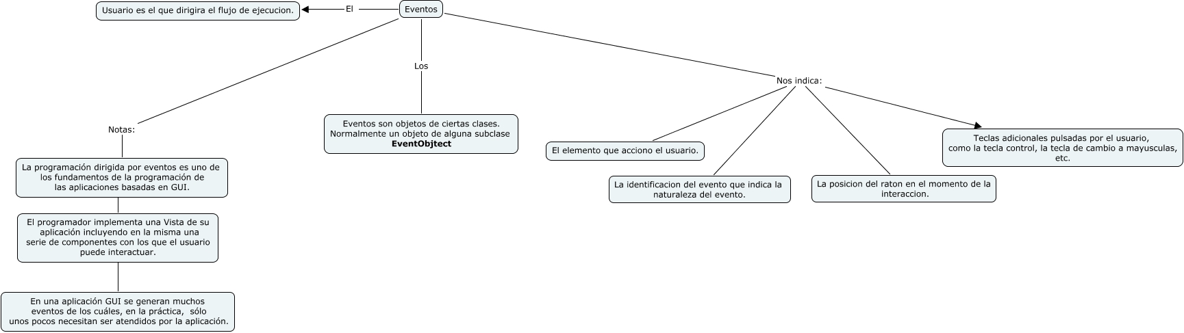 Este Cmap, tiene información relacionada con: Eventos, Eventos Los Eventos son objetos de ciertas clases. Normalmente un objeto de alguna subclase EventObjtect, Eventos Nos indica: Teclas adicionales pulsadas por el usuario, como la tecla control, la tecla de cambio a mayusculas, etc., La programación dirigida por eventos es uno de los fundamentos de la programación de las aplicaciones basadas en GUI. ???? El programador implementa una Vista de su aplicación incluyendo en la misma una serie de componentes con los que el usuario puede interactuar., Eventos Nos indica: La posicion del raton en el momento de la interaccion., Eventos Nos indica: La identificacion del evento que indica la naturaleza del evento., El programador implementa una Vista de su aplicación incluyendo en la misma una serie de componentes con los que el usuario puede interactuar. ???? En una aplicación GUI se generan muchos eventos de los cuáles, en la práctica, sólo unos pocos necesitan ser atendidos por la aplicación., Eventos El Usuario es el que dirigira el flujo de ejecucion., Eventos Nos indica: El elemento que acciono el usuario., Eventos Notas: La programación dirigida por eventos es uno de los fundamentos de la programación de las aplicaciones basadas en GUI.