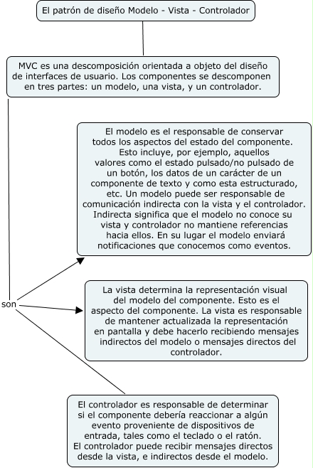 Este Cmap, tiene información relacionada con: 8 de Noviembre - 3, MVC es una descomposición orientada a objeto del diseño de interfaces de usuario. Los componentes se descomponen en tres partes: un modelo, una vista, y un controlador. son El modelo es el responsable de conservar todos los aspectos del estado del componente. Esto incluye, por ejemplo, aquellos valores como el estado pulsado/no pulsado de un botón, los datos de un carácter de un componente de texto y como esta estructurado, etc. Un modelo puede ser responsable de comunicación indirecta con la vista y el controlador. Indirecta significa que el modelo no conoce su vista y controlador no mantiene referencias hacia ellos. En su lugar el modelo enviará notificaciones que conocemos como eventos., El patrón de diseño Modelo - Vista - Controlador ???? MVC es una descomposición orientada a objeto del diseño de interfaces de usuario. Los componentes se descomponen en tres partes: un modelo, una vista, y un controlador., MVC es una descomposición orientada a objeto del diseño de interfaces de usuario. Los componentes se descomponen en tres partes: un modelo, una vista, y un controlador. son El controlador es responsable de determinar si el componente debería reaccionar a algún evento proveniente de dispositivos de entrada, tales como el teclado o el ratón. El controlador puede recibir mensajes directos desde la vista, e indirectos desde el modelo., MVC es una descomposición orientada a objeto del diseño de interfaces de usuario. Los componentes se descomponen en tres partes: un modelo, una vista, y un controlador. son La vista determina la representación visual del modelo del componente. Esto es el aspecto del componente. La vista es responsable de mantener actualizada la representación en pantalla y debe hacerlo recibiendo mensajes indirectos del modelo o mensajes directos del controlador.