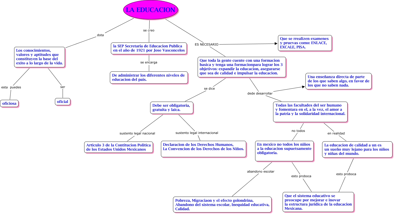 Este Cmap, tiene información relacionada con: EDUCACION, LA EDUCACION se creo la SEP Secretaria de Educacion Publica en el año de 1921 por Jose Vasconcelos, LA EDUCACION ES NECESARIO Que se rrealizen examenes y pruevas como: ENLACE, EXCALE, PISA., LA EDUCACION ES NECESARIO Que toda la gente cuente con una formacion basica y tenga una formacionpara lograr los 3 objetivos: expandir la educacion, asegurarse que sea de calidad e impulsar la educacion., Debe ser obligatoria, gratuita y laica. sustento legal nacional Articulo 3 de la Contitucion Politica de los Estados Unidos Mexicanos, Que toda la gente cuente con una formacion basica y tenga una formacionpara lograr los 3 objetivos: expandir la educacion, asegurarse que sea de calidad e impulsar la educacion. dede desarrollar Todas las facultades del ser humano y fomentara en el, a la vez, el amor a la patria y la solidaridad internacional., En mexico no todos los niños a la educacion supuetsamente obligatoria. esto proboca Que el sistema educativo se preocupe por mejorar e inovar la estructura juridica de la educacion Mexicana., Los conocimientos, valores y aptitudes que constituyen la base del exito a lo largo de la vida. ser oficial, Todas las facultades del ser humano y fomentara en el, a la vez, el amor a la patria y la solidaridad internacional. en realidad La educacion de calidad a un es un sueño muy lejano para los niños y niñas del mundo., En mexico no todos los niños a la educacion supuetsamente obligatoria. abandono escolar Pobreza, Migraciaon y el efecto golondrina, Abandono del sistema escolar, Inequidad educativa, Calidad., La educacion de calidad a un es un sueño muy lejano para los niños y niñas del mundo. esto proboca ????, Todas las facultades del ser humano y fomentara en el, a la vez, el amor a la patria y la solidaridad internacional. no todos En mexico no todos los niños a la educacion supuetsamente obligatoria., Debe ser obligatoria, gratuita y laica. sustento legal internacional Declaracion de los Derechos Humanos, La Convencion de los Derechos de los Niños., LA EDUCACION dota Los conocimientos, valores y aptitudes que constituyen la base del exito a lo largo de la vida., la SEP Secretaria de Educacion Publica en el año de 1921 por Jose Vasconcelos se encarga De administrar los diferentes niveles de educacion del pais., Que toda la gente cuente con una formacion basica y tenga una formacionpara lograr los 3 objetivos: expandir la educacion, asegurarse que sea de calidad e impulsar la educacion. dede desarrollar Una enseñanza directa de parte de los que saben algo, en favor de los que no saben nada., Que toda la gente cuente con una formacion basica y tenga una formacionpara lograr los 3 objetivos: expandir la educacion, asegurarse que sea de calidad e impulsar la educacion. se dice Debe ser obligatoria, gratuita y laica., Los conocimientos, valores y aptitudes que constituyen la base del exito a lo largo de la vida. esta puedes oficiosa