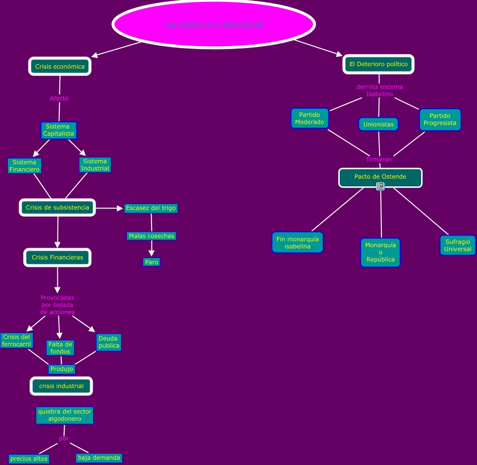 Este Cmap, tiene información relacionada con: PUNTO 1 CRISIS ECONOMICA, LAS CAUSAS DE LA REVOLUCIÓN ???? El Deterioro político, Sistema Financiero ???? Crisis de subsistencia, Sistema Capitalista ???? Sistema Financiero, Crisis de subsistencia ???? Escasez del trigo, Falta de fondos produjo Produjo, LAS CAUSAS DE LA REVOLUCIÓN ???? Crisis económica, Sistema Industrial ???? Crisis de subsistencia, Malas cosechas ???? Paro, Malas cosechas ???? Escasez del trigo, Partido Progresista firmaron Pacto de Ostende, Unionistas firmaron Pacto de Ostende, El Deterioro político derrota sistema Isabelino Unionistas, El Deterioro político derrota sistema Isabelino Partido Progresista, Pacto de Ostende ???? Fin monarquía isabelina, Sistema Capitalista ???? Sistema Industrial, quiebra del sector algodonero por precios altos, Pacto de Ostende ???? Sufragio Universal, Crisis económica Afectó Sistema Capitalista, Crisis Financieras Provocadas por bajada de acciones Deuda publica, quiebra del sector algodonero por baja demanda