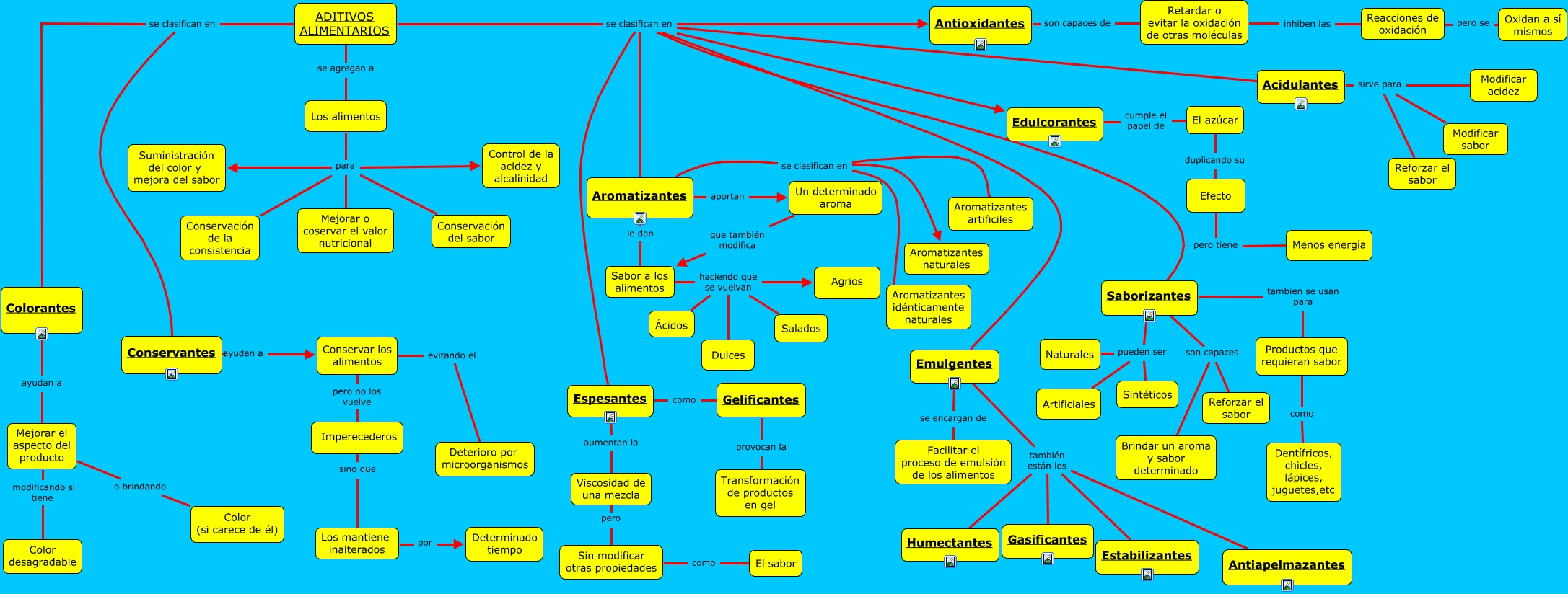 Este Cmap, tiene información relacionada con: Aditivos alimentarios, ADITIVOS ALIMENTARIOS se clasifican en Espesantes, Los alimentos para Mejorar o coservar el valor nutricional, ADITIVOS ALIMENTARIOS se clasifican en Colorantes, Aromatizantes se clasifican en Aromatizantes artificiles, Los alimentos para Suministración del color y mejora del sabor, Sabor a los alimentos haciendo que se vuelvan Dulces, Aromatizantes le dan Sabor a los alimentos, Aromatizantes se clasifican en Aromatizantes naturales, Conservar los alimentos evitando el Deterioro por microorganismos, Acidulantes sirve para Reforzar el sabor, Conservantes ayudan a Conservar los alimentos, Reacciones de oxidación pero se Oxidan a sí mismos, Los alimentos para Conservación del sabor, Sabor a los alimentos haciendo que se vuelvan Agrios, Emulgentes también están los Humectantes, Saborizantes pueden ser Sintéticos, Los alimentos para Conservación de la consistencia, ADITIVOS ALIMENTARIOS se clasifican en Edulcorantes, Emulgentes también están los Estabilizantes, Los mantiene inalterados por Determinado tiempo