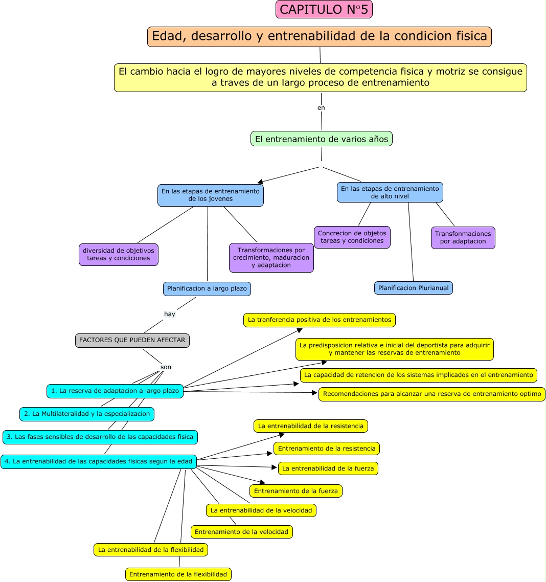 Este Cmap, tiene información relacionada con: Capitulo N°5 Desarrollo Glavas, FACTORES QUE PUEDEN AFECTAR son 2. La Multilateralidad y la especializacion, En las etapas de entrenamiento de los jovenes ???? diversidad de objetivos tareas y condiciones, FACTORES QUE PUEDEN AFECTAR son 4. La entrenabilidad de las capacidades fisicas segun la edad, FACTORES QUE PUEDEN AFECTAR son 3. Las fases sensibles de desarrollo de las capacidades fisica, 4. La entrenabilidad de las capacidades fisicas segun la edad ???? La entrenabilidad de la resistencia, 4. La entrenabilidad de las capacidades fisicas segun la edad ???? La entrenabilidad de la fuerza, 4. La entrenabilidad de las capacidades fisicas segun la edad ???? La entrenabilidad de la velocidad, El entrenamiento de varios años En las etapas de entrenamiento de alto nivel, Planificacion a largo plazo hay FACTORES QUE PUEDEN AFECTAR, 1. La reserva de adaptacion a largo plazo ???? La tranferencia positiva de los entrenamientos, En las etapas de entrenamiento de alto nivel ???? Concrecion de objetos tareas y condiciones, 1. La reserva de adaptacion a largo plazo ???? Recomendaciones para alcanzar una reserva de entrenamiento optimo, Edad, desarrollo y entrenabilidad de la condicion fisica ???? El cambio hacia el logro de mayores niveles de competencia fisica y motriz se consigue a traves de un largo proceso de entrenamiento, En las etapas de entrenamiento de alto nivel ???? Planificacion Plurianual, 4. La entrenabilidad de las capacidades fisicas segun la edad ???? Entrenamiento de la velocidad, El cambio hacia el logro de mayores niveles de competencia fisica y motriz se consigue a traves de un largo proceso de entrenamiento en El entrenamiento de varios años, 4. La entrenabilidad de las capacidades fisicas segun la edad ???? La entrenabilidad de la flexibilidad, FACTORES QUE PUEDEN AFECTAR son 1. La reserva de adaptacion a largo plazo, 1. La reserva de adaptacion a largo plazo ???? La predisposicion relativa e inicial del deportista para adquirir y mantener las reservas de entrenamiento, En las etapas de entrenamiento de los jovenes ???? Transformaciones por crecimiento, maduracion y adaptacion