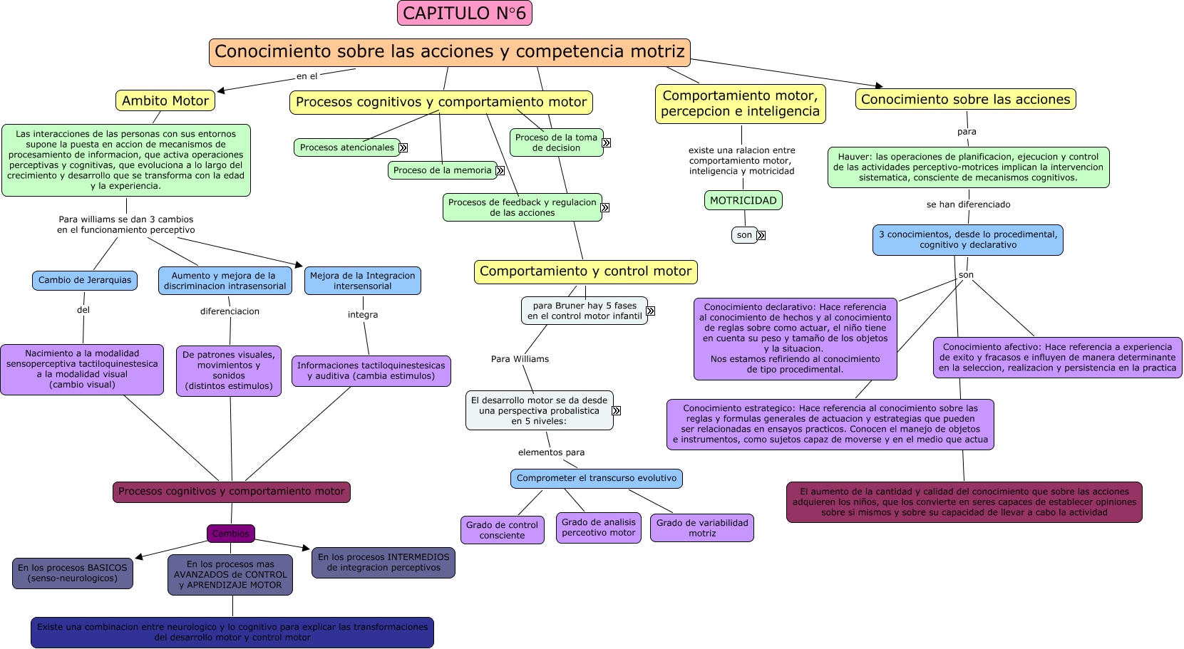 Este Cmap, tiene información relacionada con: Capitulo N°6 Desarrollo Glavas, Cambios ???? En los procesos BASICOS (senso-neurologicos), Modulacion Control de la accion e interactuar con el entorno, Comportamiento y control motor para Bruner hay 5 fases en el control motor infantil Analisis de tarea, Proceso de la memoria -Hay tres tipos de memoria: 1.Memoria sensorial (almacenamiento) 2. Memoria mediata o a largo plazo 3. Memoria inmediata o a corto plazo - -Con la edad se operan cambios visuales , auditivos y tactiloquinestesicos., Nacimiento a la modalidad sensoperceptiva tactiloquinestesica a la modalidad visual (cambio visual) ???? Procesos cognitivos y comportamiento motor, Comprometer el transcurso evolutivo ???? Grado de control consciente, Las interacciones de las personas con sus entornos supone la puesta en accion de mecanismos de procesamiento de informacion, que activa operaciones perceptivas y cognitivas, que evoluciona a lo largo del crecimiento y desarrollo que se transforma con la edad y la experiencia. Para williams se dan 3 cambios en el funcionamiento perceptivo Aumento y mejora de la discriminacion intrasensorial, 3 conocimientos, desde lo procedimental, cognitivo y declarativo son Conocimiento estrategico: Hace referencia al conocimiento sobre las reglas y formulas generales de actuacion y estrategias que pueden ser relacionadas en ensayos practicos. Conocen el manejo de objetos e instrumentos, como sujetos capaz de moverse y en el medio que actua, Las interacciones de las personas con sus entornos supone la puesta en accion de mecanismos de procesamiento de informacion, que activa operaciones perceptivas y cognitivas, que evoluciona a lo largo del crecimiento y desarrollo que se transforma con la edad y la experiencia. Para williams se dan 3 cambios en el funcionamiento perceptivo Cambio de Jerarquias, El desarrollo motor se desde una perspectiva probalistica en 5 niveles: Nivel I: Control Motor Reflejo y espontaneo (nacimiento a 12 meses), Comportamiento y control motor para Bruner hay 5 fases en el control motor infantil Modulacion, Secuenciacion Reorganizacion de los componentes, Comportamiento y control motor para Bruner hay 5 fases en el control motor infantil Modelado, Procesos cognitivos y comportamiento motor ???? Cambios, Procesos atencionales -Disposicion del organismo para RECIBIR y procesar informacion. -El movimiento, la luz, el sonido, las formas y colores son factores mas selectivos de la atencion. - La mejora se da en 4 etapas: 1.Captacion de la actividad. 2. Lo inespecifico a lo especifico. 3. Lo extenso a lo selectivo. 4. Lo irrelevante lo ignora., Cambio de Jerarquias del Nacimiento a la modalidad sensoperceptiva tactiloquinestesica a la modalidad visual (cambio visual), Procesos cognitivos y comportamiento motor ???? Proceso de la memoria, Comportamiento y control motor Para Williams El desarrollo motor se desde una perspectiva probalistica en 5 niveles:, Procesos cognitivos y comportamiento motor ???? Proceso de la toma de decision, Procesos cognitivos y comportamiento motor ???? Procesos de feedback y regulacion de las acciones