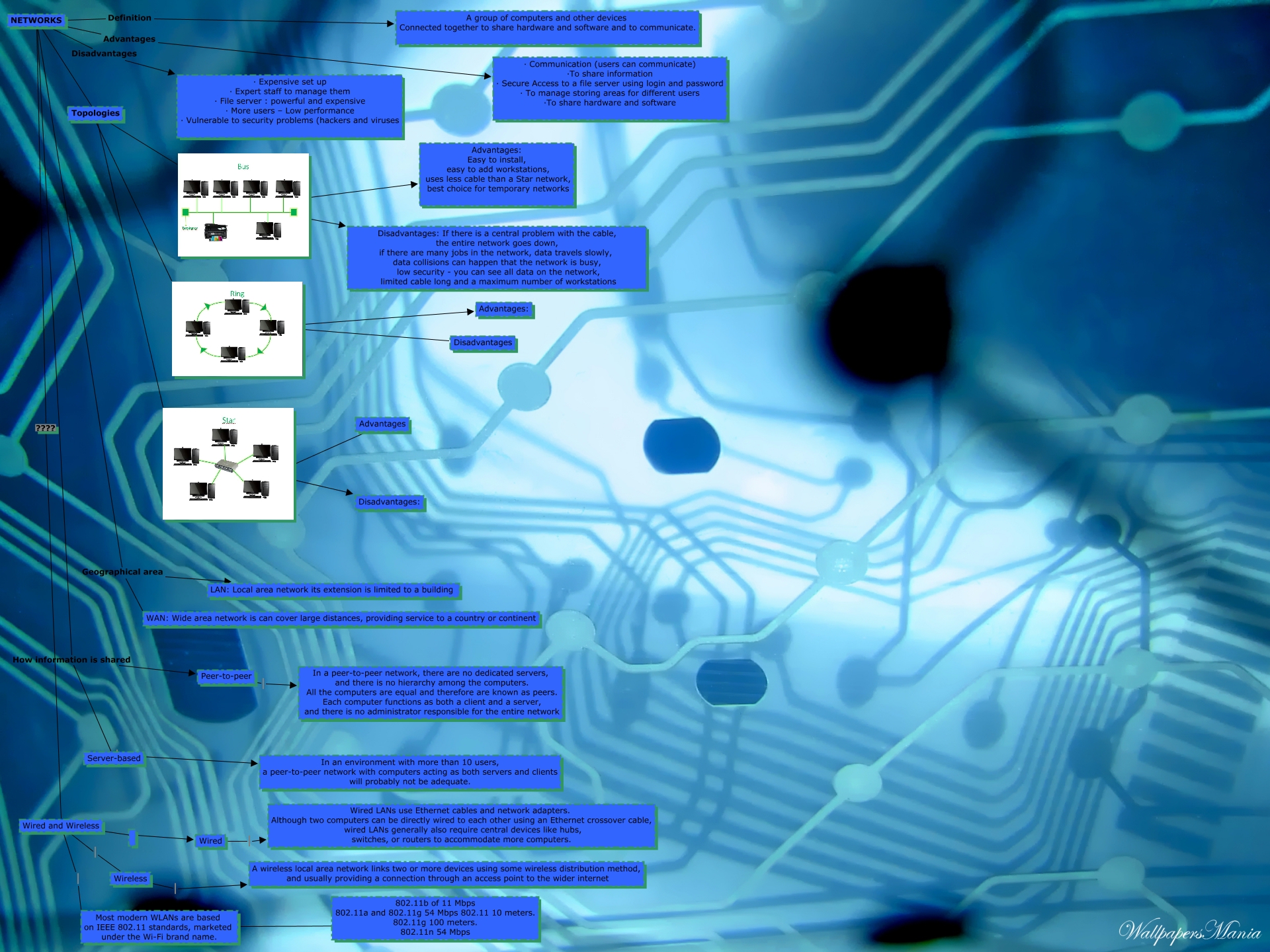 Este Cmap, tiene información relacionada con: CMAP group 4, NETWORKS Geographical area WAN: Wide area network is can cover large distances, providing service to a country or continent, NETWORKS How information is shared Peer-to-peer, Server-based In an environment with more than 10 users, a peer-to-peer network with computers acting as both servers and clients will probably not be adequate., Wired and Wireless Most modern WLANs are based on IEEE 802.11 standards, marketed under the Wi-Fi brand name., NETWORKS ???? Wired and Wireless, Topologies Disadvantages:, NETWORKS Advantages · Communication (users can communicate) ·To share information · Secure Access to a file server using login and password · To manage storing areas for different users ·To share hardware and software, Most modern WLANs are based on IEEE 802.11 standards, marketed under the Wi-Fi brand name. ???? 802.11b of 11 Mbps 802.11a and 802.11g 54 Mbps 802.11 10 meters. 802.11g 100 meters. 802.11n 54 Mbps, NETWORKS Geographical area LAN: Local area network its extension is limited to a building, Disadvantages Advantages:, NETWORKS How information is shared Server-based, Topologies Advantages: Easy to install, easy to add workstations, uses less cable than a Star network, best choice for temporary networks, Wired Wired LANs use Ethernet cables and network adapters. Although two computers can be directly wired to each other using an Ethernet crossover cable, wired LANs generally also require central devices like hubs, switches, or routers to accommodate more computers., NETWORKS ???? Topologies, Topologies Advantages:, Topologies Disadvantages: If there is a central problem with the cable, the entire network goes down, if there are many jobs in the network, data travels slowly, data collisions can happen that the network is busy, low security - you can see all data on the network, limited cable long and a maximum number of workstations, Peer-to-peer In a peer-to-peer network, there are no dedicated servers, and there is no hierarchy among the computers. All the computers are equal and therefore are known as peers. Each computer functions as both a client and a server, and there is no administrator responsible for the entire network, NETWORKS Disadvantages · Expensive set up · Expert staff to manage them · File server : powerful and expensive · More users – Low performance · Vulnerable to security problems (hackers and viruses, Wireless A wireless local area network links two or more devices using some wireless distribution method, and usually providing a connection through an access point to the wider internet, Advantages Disadvantages: