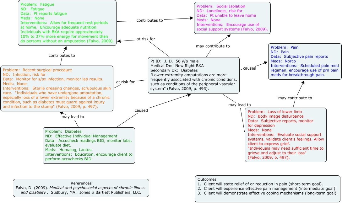 This Concept Map, created with IHMC CmapTools, has information related to: Acute Conditions, Pt ID: J. D. 56 y/o male Medical Dx: New Right BKA Secondary Dx: Diabetes "Lower extremity amputations are more frequently associated with chronic conditions, such as conditions of the peripheral vascular system" (Falvo, 2009, p. 493). may contribute to Problem: Social Isolation ND: Loneliness, risk for Data: Pt unable to leave home Meds: None Interventions: Encourage use of social support systems (Falvo, 2009)., Problem: Diabetes ND: Effective Individual Management Data: Accucheck readings BID, monitor labs, evaluate diet. Meds: Humalog, Lantus Interventions: Education, encourage client to perform accuchecks BID. may lead to Problem: Recent surgical procedure ND: Infection, risk for Data: Monitor for s/sx infection, monitor lab results. Meds: None Interventions: Sterile dressing changes, scrupulous skin care. "Individuals who have undergone amputation, especially loss of a lower extremity because of a chronic condition, such as diabetes must guard against injury and infection to the stump" (Falvo, 2009, p. 497)., Problem: Diabetes ND: Effective Individual Management Data: Accucheck readings BID, monitor labs, evaluate diet. Meds: Humalog, Lantus Interventions: Education, encourage client to perform accuchecks BID. caused Pt ID: J. D. 56 y/o male Medical Dx: New Right BKA Secondary Dx: Diabetes "Lower extremity amputations are more frequently associated with chronic conditions, such as conditions of the peripheral vascular system" (Falvo, 2009, p. 493)., Pt ID: J. D. 56 y/o male Medical Dx: New Right BKA Secondary Dx: Diabetes "Lower extremity amputations are more frequently associated with chronic conditions, such as conditions of the peripheral vascular system" (Falvo, 2009, p. 493). may lead to Problem: Loss of lower limb ND: Body image disturbance Data: Subjective reports, monitor for depression Meds: None Interventions: Evaluate social support systems, validate client's feelings. Allow client to express grief. "Individuals may need sufficient time to grieve and adjust to their loss" (Falvo, 2009, p. 497)., Problem: Fatigue ND: Fatigue Data: Pt reports fatigue Meds: None Interventions: Allow for frequent rest periods at home. Encourage adequate nutrition. Individuals with BKA require approximately 10% to 37% more energy for movement than do persons without an amputation (Falvo, 2009). contributes to Problem: Social Isolation ND: Loneliness, risk for Data: Pt unable to leave home Meds: None Interventions: Encourage use of social support systems (Falvo, 2009)., Problem: Recent surgical procedure ND: Infection, risk for Data: Monitor for s/sx infection, monitor lab results. Meds: None Interventions: Sterile dressing changes, scrupulous skin care. "Individuals who have undergone amputation, especially loss of a lower extremity because of a chronic condition, such as diabetes must guard against injury and infection to the stump" (Falvo, 2009, p. 497). contributes to Problem: Fatigue ND: Fatigue Data: Pt reports fatigue Meds: None Interventions: Allow for frequent rest periods at home. Encourage adequate nutrition. Individuals with BKA require approximately 10% to 37% more energy for movement than do persons without an amputation (Falvo, 2009)., Pt ID: J. D. 56 y/o male Medical Dx: New Right BKA Secondary Dx: Diabetes "Lower extremity amputations are more frequently associated with chronic conditions, such as conditions of the peripheral vascular system" (Falvo, 2009, p. 493). at risk for Problem: Fatigue ND: Fatigue Data: Pt reports fatigue Meds: None Interventions: Allow for frequent rest periods at home. Encourage adequate nutrition. Individuals with BKA require approximately 10% to 37% more energy for movement than do persons without an amputation (Falvo, 2009)., Pt ID: J. D. 56 y/o male Medical Dx: New Right BKA Secondary Dx: Diabetes "Lower extremity amputations are more frequently associated with chronic conditions, such as conditions of the peripheral vascular system" (Falvo, 2009, p. 493). causes Problem: Pain ND: Pain Data: Subjective pain reports Meds: Norco Interventions: Scheduled pain med regimen, encourage use of prn pain meds for breakthrough pain., Problem: Loss of lower limb ND: Body image disturbance Data: Subjective reports, monitor for depression Meds: None Interventions: Evaluate social support systems, validate client's feelings. Allow client to express grief. "Individuals may need sufficient time to grieve and adjust to their loss" (Falvo, 2009, p. 497). may contribute to Problem: Pain ND: Pain Data: Subjective pain reports Meds: Norco Interventions: Scheduled pain med regimen, encourage use of prn pain meds for breakthrough pain., Pt ID: J. D. 56 y/o male Medical Dx: New Right BKA Secondary Dx: Diabetes "Lower extremity amputations are more frequently associated with chronic conditions, such as conditions of the peripheral vascular system" (Falvo, 2009, p. 493). at risk for Problem: Recent surgical procedure ND: Infection, risk for Data: Monitor for s/sx infection, monitor lab results. Meds: None Interventions: Sterile dressing changes, scrupulous skin care. "Individuals who have undergone amputation, especially loss of a lower extremity because of a chronic condition, such as diabetes must guard against injury and infection to the stump" (Falvo, 2009, p. 497).