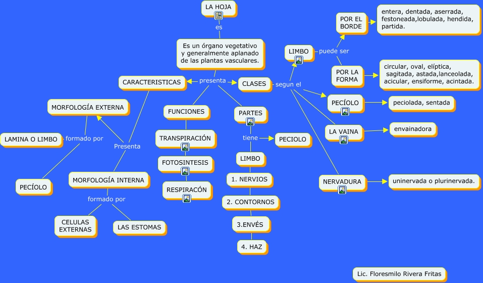 Este Cmap, tiene información relacionada con: LA HOJA, PECÍOLO peciolada, sentada, MORFOLOGÍA EXTERNA formado por LAMINA O LIMBO, FOTOSINTESIS RESPIRACÓN, MORFOLOGÍA INTERNA formado por LAS ESTOMAS, Es un órgano vegetativo y generalmente aplanado de las plantas vasculares. presenta PARTES, TRANSPIRACIÓN FOTOSINTESIS, LIMBO puede ser POR EL BORDE, FUNCIONES TRANSPIRACIÓN, 1. NERVIOS 2. CONTORNOS, 3.ENVÉS 4. HAZ, LIMBO puede ser POR LA FORMA, MORFOLOGÍA EXTERNA formado por PECÍOLO, POR EL BORDE entera, dentada, aserrada, festoneada,lobulada, hendida, partida., CARACTERISTICAS Presenta MORFOLOGÍA EXTERNA, PARTES tiene PECIOLO, 2. CONTORNOS 3.ENVÉS, NERVADURA uninervada o plurinervada., Es un órgano vegetativo y generalmente aplanado de las plantas vasculares. presenta FUNCIONES, Es un órgano vegetativo y generalmente aplanado de las plantas vasculares. presenta CLASES, PARTES tiene LIMBO