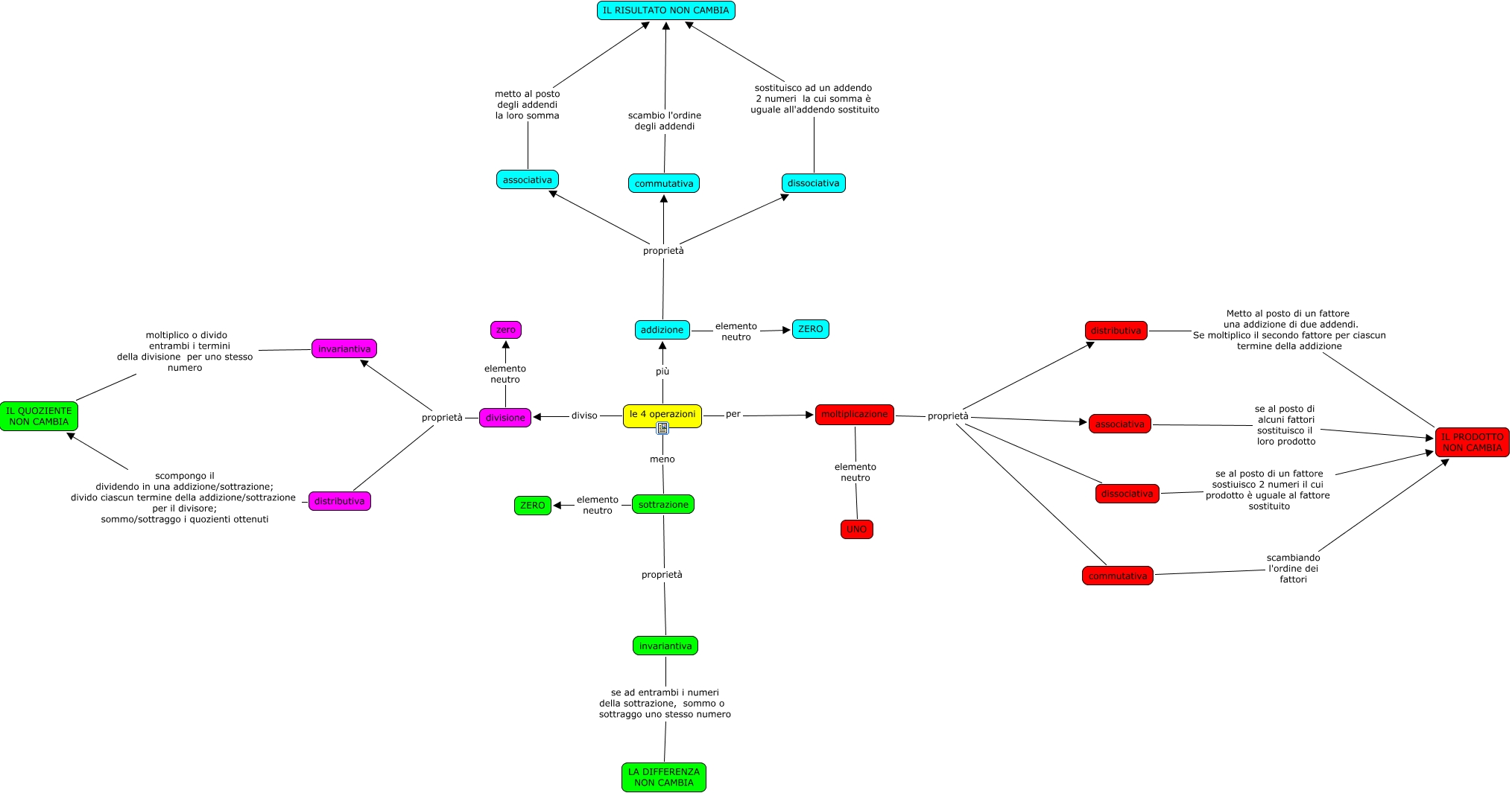 Questa Cmap, creata con IHMC CmapTools, contiene informazioni relative a: le 4 operazioni, associativa se al posto di alcuni fattori sostituisco il loro prodotto IL PRODOTTO NON CAMBIA, moltiplicazione proprietà dissociativa, moltiplicazione proprietà commutativa, distributiva scompongo il dividendo in una addizione/sottrazione; divido ciascun termine della addizione/sottrazione per il divisore; sommo/sottraggo i quozienti ottenuti IL QUOZIENTE NON CAMBIA, sottrazione elemento neutro ZERO, moltiplicazione proprietà distributiva, invariantiva moltiplico o divido entrambi i termini della divisione per uno stesso numero IL QUOZIENTE NON CAMBIA, commutativa scambiando l'ordine dei fattori IL PRODOTTO NON CAMBIA, commutativa scambio l'ordine degli addendi IL RISULTATO NON CAMBIA, moltiplicazione proprietà associativa, moltiplicazione elemento neutro UNO, invariantiva se ad entrambi i numeri della sottrazione, sommo o sottraggo uno stesso numero LA DIFFERENZA NON CAMBIA, dissociativa se al posto di un fattore sostiuisco 2 numeri il cui prodotto è uguale al fattore sostituito IL PRODOTTO NON CAMBIA, le 4 operazioni meno sottrazione, addizione proprietà associativa, divisione proprietà invariantiva, dissociativa sostituisco ad un addendo 2 numeri la cui somma è uguale all'addendo sostituito IL RISULTATO NON CAMBIA, addizione proprietà dissociativa, addizione elemento neutro ZERO, le 4 operazioni diviso divisione