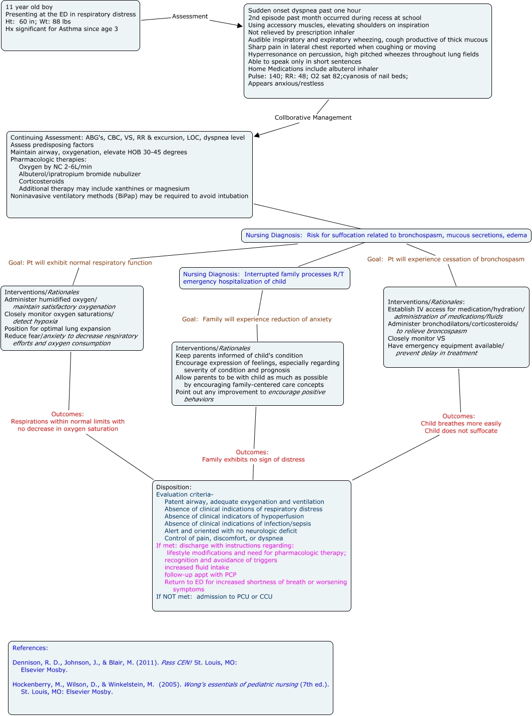This Concept Map, created with IHMC CmapTools, has information related to: Acute Asthma Attack, Interventions/Rationales Administer humidified oxygen/ maintain satisfactory oxygenation Closely monitor oxygen saturations/ detect hypoxia Position for optimal lung expansion Reduce fear/anxiety to decrease respiratory efforts and oxygen consumption Outcomes: Respirations within normal limits with no decrease in oxygen saturation Disposition: Evaluation criteria- Patent airway, adequate exygenation and ventilation Absence of clinical indications of respiratory distress Absence of clinical indicators of hypoperfusion Absence of clinical indications of infection/sepsis Alert and oriented with no neurologic deficit Control of pain, discomfort, or dyspnea If met: discharge with instructions regarding: lifestyle modifications and need for pharmacologic therapy; recognition and avoidance of triggers increased fluid intake follow-up appt with PCP Return to ED for increased shortness of breath or worsening symptoms If NOT met: admission to PCU or CCU, Nursing Diagnosis: Risk for suffocation related to bronchospasm, mucous secretions, edema Goal: Pt will experience cessation of bronchospasm Interventions/Rationales: Establish IV access for medication/hydration/ administration of medications/fluids Administer bronchodilators/corticosteroids/ to relieve broncospasm Closely monitor VS Have emergency equipment available/ prevent delay in treatment, Nursing Diagnosis: Risk for suffocation related to bronchospasm, mucous secretions, edema Goal: Pt will exhibit normal respiratory function Interventions/Rationales Administer humidified oxygen/ maintain satisfactory oxygenation Closely monitor oxygen saturations/ detect hypoxia Position for optimal lung expansion Reduce fear/anxiety to decrease respiratory efforts and oxygen consumption, Continuing Assessment: ABG's, CBC, VS, RR & excursion, LOC, dyspnea level Assess predisposing factors Maintain airway, oxygenation, elevate HOB 30-45 degrees Pharmacologic therapies: Oxygen by NC 2-6L/min Albuterol/ipratropium bromide nubulizer Corticosteroids Additional therapy may include xanthines or magnesium Noninavasive ventilatory methods (BiPap) may be required to avoid intubation ???? Nursing Diagnosis: Risk for suffocation related to bronchospasm, mucous secretions, edema, Sudden onset dyspnea past one hour 2nd episode past month occurred during recess at school Using accessory muscles, elevating shoulders on inspiration Not relieved by prescription inhaler Audible inspiratory and expiratory wheezing, cough productive of thick mucous Sharp pain in lateral chest reported when coughing or moving Hyperresonance on percussion, high pitched wheezes throughout lung fields Able to speak only in short sentences Home Medications include albuterol inhaler Pulse: 140; RR: 48; O2 sat 82;cyanosis of nail beds; Appears anxious/restless Collborative Management Continuing Assessment: ABG's, CBC, VS, RR & excursion, LOC, dyspnea level Assess predisposing factors Maintain airway, oxygenation, elevate HOB 30-45 degrees Pharmacologic therapies: Oxygen by NC 2-6L/min Albuterol/ipratropium bromide nubulizer Corticosteroids Additional therapy may include xanthines or magnesium Noninavasive ventilatory methods (BiPap) may be required to avoid intubation, Nursing Diagnosis: Risk for suffocation related to bronchospasm, mucous secretions, edema ???? Nursing Diagnosis: Interrupted family processes R/T emergency hospitalization of child, Interventions/Rationales Keep parents informed of child's condition Encourage expression of feelings, especially regarding severity of condition and prognosis Allow parents to be with child as much as possible by encouraging family-centered care concepts Point out any improvement to encourage positive behaviors Outcomes: Family exhibits no sign of distress Disposition: Evaluation criteria- Patent airway, adequate exygenation and ventilation Absence of clinical indications of respiratory distress Absence of clinical indicators of hypoperfusion Absence of clinical indications of infection/sepsis Alert and oriented with no neurologic deficit Control of pain, discomfort, or dyspnea If met: discharge with instructions regarding: lifestyle modifications and need for pharmacologic therapy; recognition and avoidance of triggers increased fluid intake follow-up appt with PCP Return to ED for increased shortness of breath or worsening symptoms If NOT met: admission to PCU or CCU, 11 year old boy Presenting at the ED in respiratory distress Ht: 60 in; Wt: 88 lbs Hx significant for Asthma since age 3 Assessment Sudden onset dyspnea past one hour 2nd episode past month occurred during recess at school Using accessory muscles, elevating shoulders on inspiration Not relieved by prescription inhaler Audible inspiratory and expiratory wheezing, cough productive of thick mucous Sharp pain in lateral chest reported when coughing or moving Hyperresonance on percussion, high pitched wheezes throughout lung fields Able to speak only in short sentences Home Medications include albuterol inhaler Pulse: 140; RR: 48; O2 sat 82;cyanosis of nail beds; Appears anxious/restless, Nursing Diagnosis: Interrupted family processes R/T emergency hospitalization of child Goal: Family will experience reduction of anxiety Interventions/Rationales Keep parents informed of child's condition Encourage expression of feelings, especially regarding severity of condition and prognosis Allow parents to be with child as much as possible by encouraging family-centered care concepts Point out any improvement to encourage positive behaviors, Interventions/Rationales: Establish IV access for medication/hydration/ administration of medications/fluids Administer bronchodilators/corticosteroids/ to relieve broncospasm Closely monitor VS Have emergency equipment available/ prevent delay in treatment Outcomes: Child breathes more easily Child does not suffocate Disposition: Evaluation criteria- Patent airway, adequat