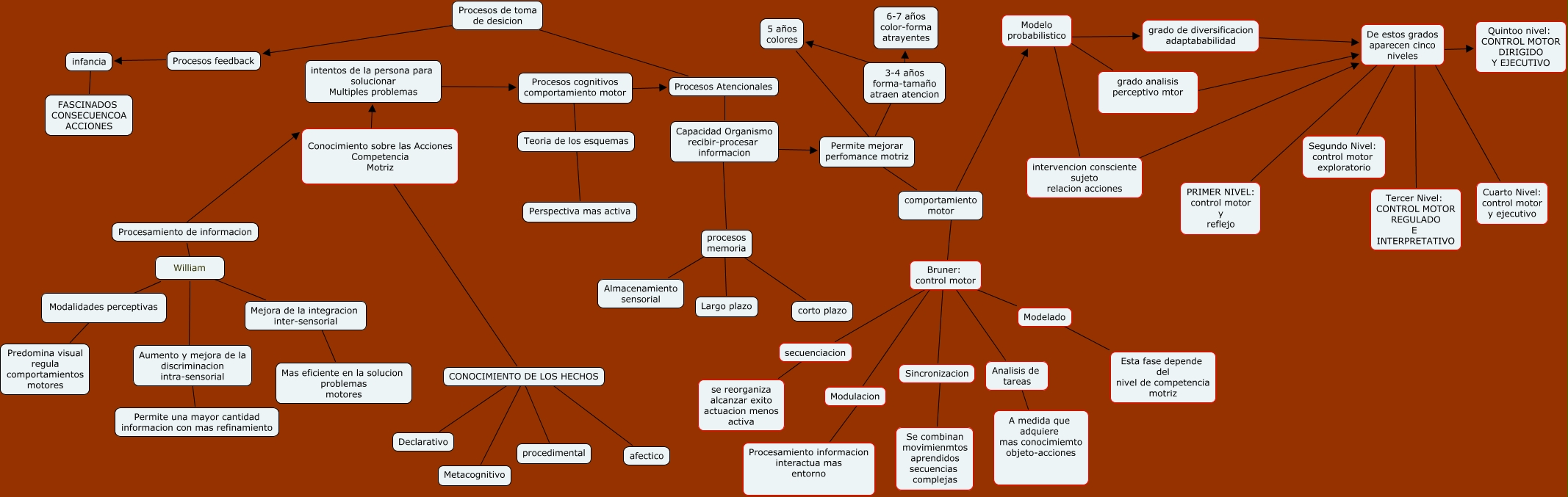 Este Cmap, tiene información relacionada con: CAPITULO 6, Modelo probabilistico ???? intervencion consciente sujeto relacion acciones, Bruner: control motor ???? Modulacion, Aumento y mejora de la discriminacion intra-sensorial ???? Permite una mayor cantidad informacion con mas refinamiento, intentos de la persona para solucionar Multiples problemas ???? Procesos cognitivos comportamiento motor, Declarativo ???? CONOCIMIENTO DE LOS HECHOS, corto plazo ???? procesos memoria, comportamiento motor ???? Modelo probabilistico, CONOCIMIENTO DE LOS HECHOS ???? procedimental, Mejora de la integracion inter-sensorial ???? Mas eficiente en la solucion problemas motores, Bruner: control motor ???? Analisis de tareas, Permite mejorar perfomance motriz ???? comportamiento motor, Capacidad Organismo recibir-procesar informacion ???? Permite mejorar perfomance motriz, grado analisis perceptivo mtor ???? De estos grados aparecen cinco niveles, Modelo probabilistico ???? grado de diversificacion adaptababilidad, intervencion consciente sujeto relacion acciones ???? De estos grados aparecen cinco niveles, infancia ???? FASCINADOS CONSECUENCOA ACCIONES, De estos grados aparecen cinco niveles ???? Tercer Nivel: CONTROL MOTOR REGULADO E INTERPRETATIVO, CONOCIMIENTO DE LOS HECHOS ???? Metacognitivo, CONOCIMIENTO DE LOS HECHOS ???? afectico, Analisis de tareas ???? A medida que adquiere mas conocimiemto objeto-acciones