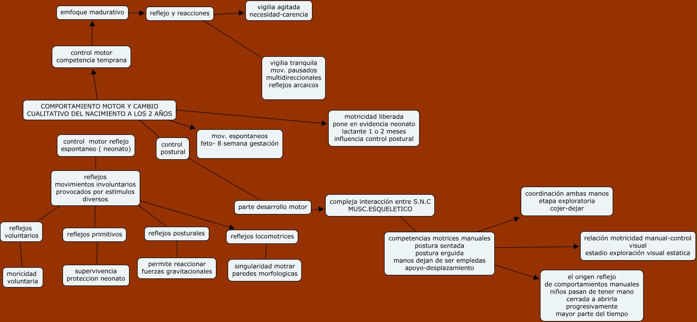 Este Cmap, tiene información relacionada con: Capitulo 2, reflejos voluntarios ???? moricidad voluntaria, competencias motrices manuales postura sentada postura erguida manos dejan de ser empledas apoyo-desplazamiento ???? el origen reflejo de comportamientos manuales niños pasan de tener mano cerrada a abrirla progresivamente mayor parte del tiempo, emfoque madurativo ???? reflejo y reacciones, COMPORTAMIENTO MOTOR Y CAMBIO CUALITATIVO DEL NACIMIENTO A LOS 2 AÑOS ???? motricidad liberada pone en evidencia neonato lactante 1 o 2 meses influencia control postural, reflejos posturales ???? permite reaccionar fuerzas gravitacionales, competencias motrices manuales postura sentada postura erguida manos dejan de ser empledas apoyo-desplazamiento ???? relación motricidad manual-control visual estadio exploración visual estatica, reflejo y reacciones ???? vigilia tranquila mov. pausados multidireccionales reflejos arcaicos, control motor competencia temprana ???? emfoque madurativo, compleja interacción entre S.N.C MUSC.ESQUELETICO ???? competencias motrices manuales postura sentada postura erguida manos dejan de ser empledas apoyo-desplazamiento, reflejos primitivos ???? supervivencia proteccion neonato, COMPORTAMIENTO MOTOR Y CAMBIO CUALITATIVO DEL NACIMIENTO A LOS 2 AÑOS ???? control postural, parte desarrollo motor ???? compleja interacción entre S.N.C MUSC.ESQUELETICO, reflejos movimientos involuntarios provocados por estimulos diversos ???? reflejos posturales, reflejo y reacciones ???? vigilia agitada necesidad-carencia, reflejos movimientos involuntarios provocados por estimulos diversos ???? reflejos voluntarios, reflejos movimientos involuntarios provocados por estimulos diversos ???? reflejos primitivos, reflejos movimientos involuntarios provocados por estimulos diversos ???? reflejos locomotrices, competencias motrices manuales postura sentada postura erguida manos dejan de ser empledas apoyo-desplazamiento ???? coordinación ambas manos etapa exploratoria cojer-dejar, reflejos locomotrices ???? singularidad motrar paredes morfologicas, COMPORTAMIENTO MOTOR Y CAMBIO CUALITATIVO DEL NACIMIENTO A LOS 2 AÑOS ???? control motor competencia temprana