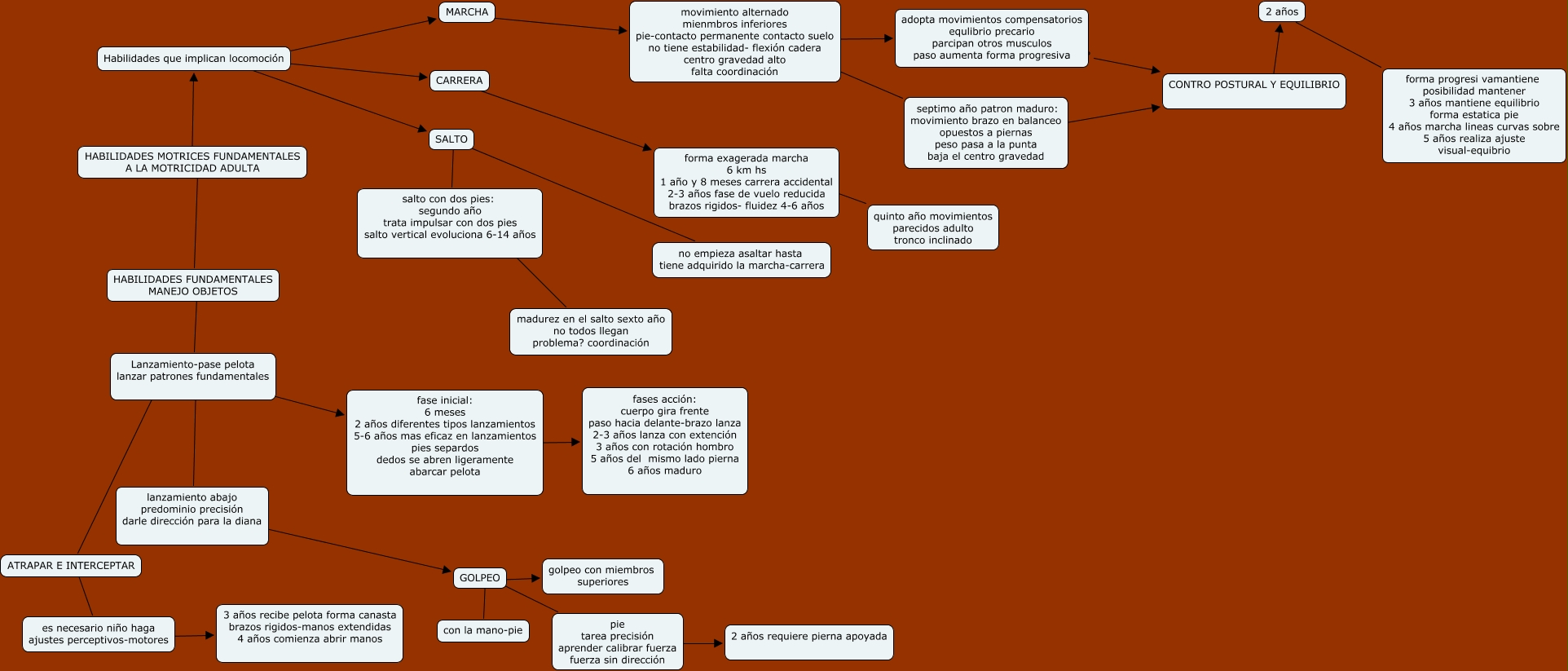 Este Cmap, tiene información relacionada con: capitulo 3, salto con dos pies: segundo año trata impulsar con dos pies salto vertical evoluciona 6-14 años ???? madurez en el salto sexto año no todos llegan problema? coordinación, movimiento alternado mienmbros inferiores pie-contacto permanente contacto suelo no tiene estabilidad- flexión cadera centro gravedad alto falta coordinación ???? septimo año patron maduro: movimiento brazo en balanceo opuestos a piernas peso pasa a la punta baja el centro gravedad, Lanzamiento-pase pelota lanzar patrones fundamentales ???? fase inicial: 6 meses 2 años diferentes tipos lanzamientos 5-6 años mas eficaz en lanzamientos pies separdos dedos se abren ligeramente abarcar pelota, Habilidades que implican locomoción ???? SALTO, Lanzamiento-pase pelota lanzar patrones fundamentales ???? ATRAPAR E INTERCEPTAR, Lanzamiento-pase pelota lanzar patrones fundamentales ???? lanzamiento abajo predominio precisión darle dirección para la diana, es necesario niño haga ajustes perceptivos-motores ???? 3 años recibe pelota forma canasta brazos rigidos-manos extendidas 4 años comienza abrir manos, Habilidades que implican locomoción ???? MARCHA, movimiento alternado mienmbros inferiores pie-contacto permanente contacto suelo no tiene estabilidad- flexión cadera centro gravedad alto falta coordinación ???? adopta movimientos compensatorios equlibrio precario parcipan otros musculos paso aumenta forma progresiva, SALTO ???? salto con dos pies: segundo año trata impulsar con dos pies salto vertical evoluciona 6-14 años, forma exagerada marcha 6 km hs 1 año y 8 meses carrera accidental 2-3 años fase de vuelo reducida brazos rigidos- fluidez 4-6 años ???? quinto año movimientos parecidos adulto tronco inclinado, lanzamiento abajo predominio precisión darle dirección para la diana ???? GOLPEO, CARRERA ???? forma exagerada marcha 6 km hs 1 año y 8 meses carrera accidental 2-3 años fase de vuelo reducida brazos rigidos- fluidez 4-6 años, GOLPEO ???? con la mano-pie, fase inicial: 6 meses 2 años diferentes tipos lanzamientos 5-6 años mas eficaz en lanzamientos pies separdos dedos se abren ligeramente abarcar pelota ???? fases acción: cuerpo gira frente paso hacia delante-brazo lanza 2-3 años lanza con extención 3 años con rotación hombro 5 años del mismo lado pierna 6 años maduro, SALTO ???? no empieza asaltar hasta tiene adquirido la marcha-carrera, septimo año patron maduro: movimiento brazo en balanceo opuestos a piernas peso pasa a la punta baja el centro gravedad ???? CONTRO POSTURAL Y EQUILIBRIO, HABILIDADES MOTRICES FUNDAMENTALES A LA MOTRICIDAD ADULTA ???? HABILIDADES FUNDAMENTALES MANEJO OBJETOS, GOLPEO ???? golpeo con miembros superiores, 2 años ???? forma progresi vamantiene posibilidad mantener 3 años mantiene equilibrio forma estatica pie 4 años marcha lineas curvas sobre 5 años realiza ajuste visual-equibrio