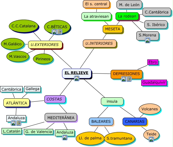 Este Cmap, tiene información relacionada con: EL RELIEVE, EL RELIEVE ???? U.EXTERIORES, U.EXTERIORES ???? M.Vascos, ATLÁNTICA ???? Gallega, La rodean ???? S. Ibérico, U.EXTERIORES ???? M.Galáico, U.INTERIORES ???? MESETA, DEPRESIONES ???? Guadalquivir, EL RELIEVE ???? insula, COSTAS ???? ????, EL RELIEVE ???? U.INTERIORES, MESETA ???? La rodean, La atraviesan ???? El s. central, CANARIAS ???? Teide, MEDITERÁNEA ???? G. de Valencia, DEPRESIONES ???? Ebro, BALEARES ???? S.tramuntana, La rodean ???? M. de León, BALEARES ???? Ll. de palma, U.EXTERIORES ???? Pirineos, La rodean ???? C.Cantábrica