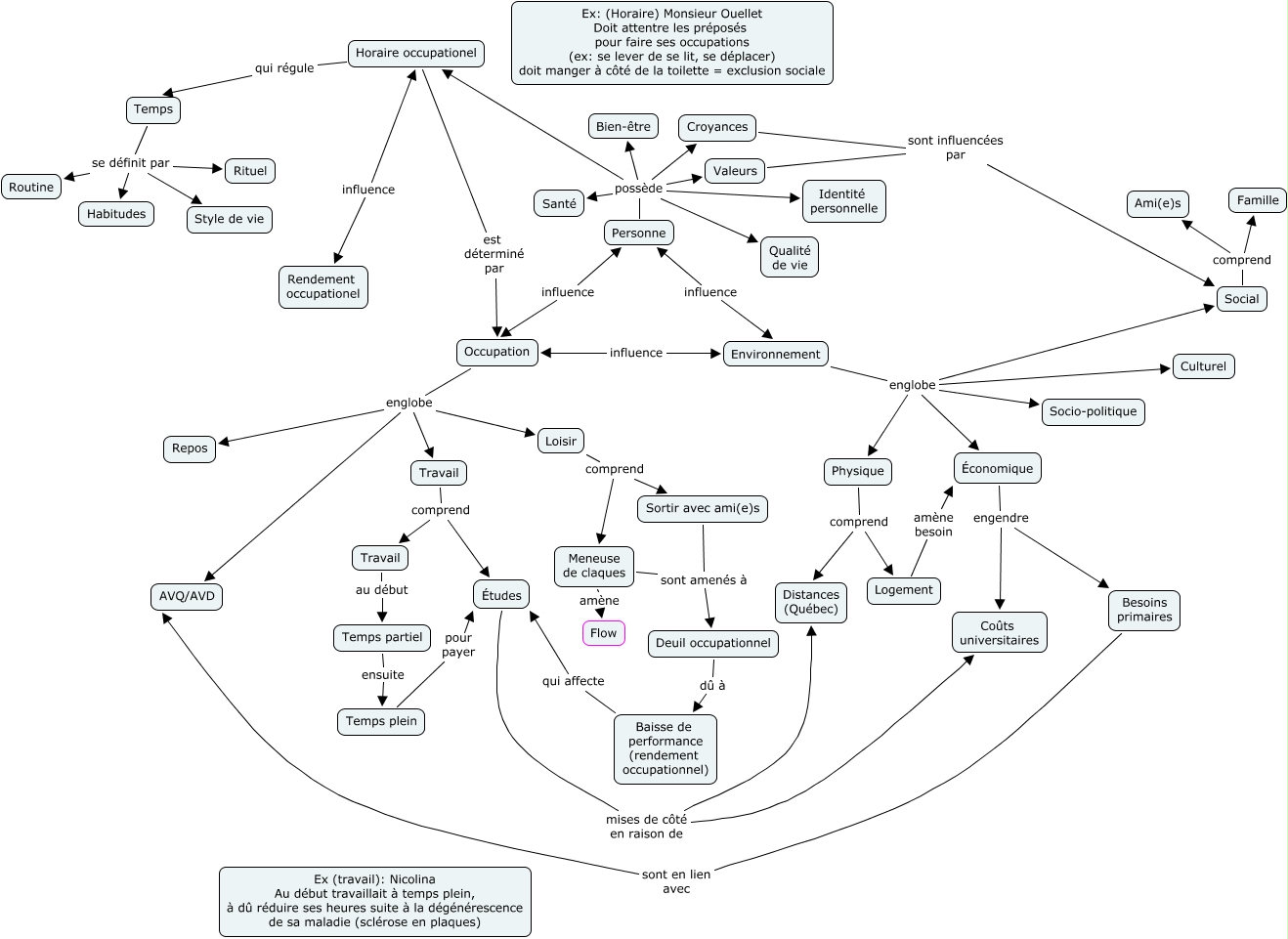 Cette carte de concepts créée avec IHMC CmapTools traite de: C-Map (ert 1400), Social comprend Ami(e)s, Travail comprend Études, Personne possède Croyances, Temps se définit par Style de vie, Valeurs sont influencées par Social, Loisir comprend Meneuse de claques, Occupation englobe Travail, Environnement englobe Physique, Loisir comprend Sortir avec ami(e)s, Croyances sont influencées par Social, Deuil occupationnel dû à Baisse de performance (rendement occupationnel), Personne possède Santé, Personne possède Qualité de vie, Travail au début Temps partiel, Temps se définit par Rituel, Environnement englobe Économique, Meneuse de claques amène Flow, Personne possède Bien-être, Environnement englobe Culturel, Horaire occupationel est déterminé par Occupation