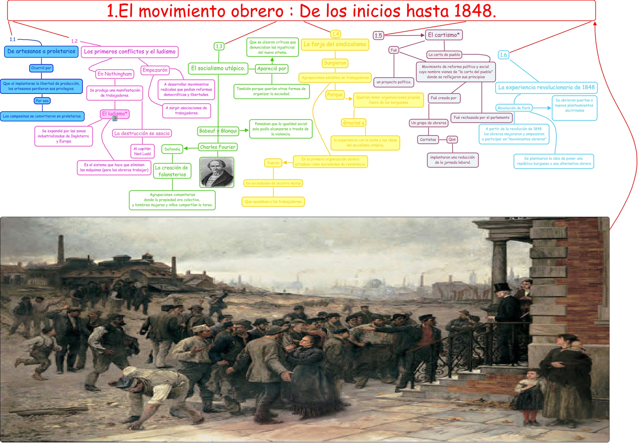 Este Cmap, tiene información relacionada con: Trabajo punto1, Movimiento de reforma política y social cuyo nombre vienes de "la carta del pueblo" donde se reflejaron sus principios ???? Fué rechazada por el parlamento, 1.El movimiento obrero : De los inicios hasta 1848. 1.5 El cartismo*, La forja del sindicalismo Surgieron Agrupaciones estables de trabajadores, La experiencia revolucionaria de 1848 Revolución de París A partir de la revolución de 1848 los obreros mejoraron y empezaron a participar en "movimientos obreros", Se produjo una manifestación de trabajadores. El ludismo* Es el sistema que hace que eliminen las máquinas (para los obreros trabajar), Los primeros conflictos y el ludismo Empezarón A desarrollar movimientos radicales que pedian reformas democráticas y libertades., El socialismo utópico. Charles Fourier, El socialismo utópico. Apareció por Que se alzaron críticas que denunciaban las injusticias del nuevo sitema., El cartismo* La carta de pueblo Fué creada por, El socialismo utópico. Apareció por También porque querían otras formas de organizar la sociedad., Agrupaciones estables de trabajadores Porque Querían tener organizaciones propias fuera de los burgueses, 1.El movimiento obrero : De los inicios hasta 1848. 1.4 La forja del sindicalismo, Fueron las sociedades de socorro mutuo Que ayudaban a los trabajadores., Cartistas Que implantaron una reducción de la jornada laboral., Se produjo una manifestación de trabajadores. La destrucción se asocio Al capitán Ned Ludd, El socialismo utópico. Charles Fourier Defendia, ???? ???? 1.El movimiento obrero : De los inicios hasta 1848., Se produjo una manifestación de trabajadores. El ludismo* Se expandió por las zonas industrializadas de Inglaterra y Europa, De artesanos a proletarios Ocurrió por Que al implantarse la libertad de producción, los artesanos perdieron sus privilegios., Defendia La creación de falansterios Agrupaciones comunitarias donde la propiedad era colectiva, y hombres mujeres y niños compartían la tarea.