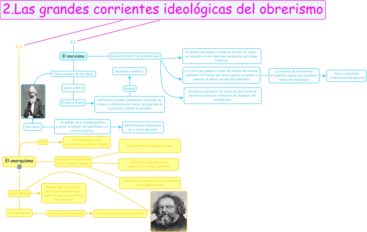 Este Cmap, tiene información relacionada con: Trabajo punto2, 2.Las grandes corrientes ideológicas del obrerismo 2.2 El anarquismo, El marxismo Toma el nombre de Karl Marx quien, junto a, Consideraba la propiedad un robo Su primer referente fue Pierre-Joseph Proudhon Y también en la expansión del mutualismo y del cooperativismo, El marxismo Toma el nombre de Karl Marx Karl Marx, Calificaron el primer pensamiento socialista de utópico y elaboraron una teoría, un programa de acción para cambiar la sociedad. llamado Socialismo científico., Defendió un sistema social basado en el trabajo autónomo. Su primer referente fue Pierre-Joseph Proudhon Y también en la expansión del mutualismo y del cooperativismo, El anarquismo no es Tan homogéneo como el elaborado por Marx y Engels, La crítica del pasado a través del análisis del sistema capitalista. El trabajo del obrero genera un beneficio superior al salario que percibe (plusvalía) La voluntad de incrementar el beneficio supone una constante innovación tecnologica lleva a constantes crisis de sobreproducción, El anarquismo Mijaíl Bakunin, El anarquismo Mijaíl Bakunin Su objetivo era, 2.Las grandes corrientes ideológicas del obrerismo 2.1 El marxismo, Karl Marx Su análisis de la realidad política y social, el estudio del capitalismo y la práctica politica posibilitaron la elaboración de la teoría marxista., El marxismo Se asienta sobre tres grandes ejes: La crítica del pasado a través del análisis del sistema capitalista. El trabajo del obrero genera un beneficio superior al salario que percibe (plusvalía), quien, junto a Friedrich Engels Calificaron el primer pensamiento socialista de utópico y elaboraron una teoría, un programa de acción para cambiar la sociedad., El anarquismo Mijaíl Bakunin Planteó que la revolución estaría protagonizada por todos los sectores oprimidos de la sociedad, El marxismo Se asienta sobre tres grandes ejes: Se asocia un proyecto de futuro de esta forma se abriría una situación transitoria de dictadura del proletariado., El marxismo Se asienta sobre tres grandes ejes: El análisis del pasado a tráves de la lucha de clases, se originaba en las relaciones sociales de cada etapa histórica., Su objetivo era La destrucción del Estado La creación de un estado igualitario, Karl Marx, El anarquismo Su primer referente fue Pierre-Joseph Proudhon Y también en la expansión del mutualismo y del cooperativismo