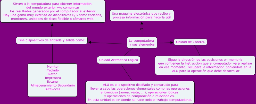 Este Cmap, tiene información relacionada con: ElementosDlaComputadora152BZolozabalFragozoD, Unidad Aritmética Lógica ???? ALU es el dispositivo diseñado y construido para llevar a cabo las operaciones elementales como las operaciones aritméticas (suma, resta, ...), operaciones lógicas y operaciones de comparación o relacionales. En esta unidad es en donde se hace todo el trabajo computacional., La computadora y sus elementos ???? Unidad Aritmética Lógica, Tine dispositivos de entrada y salida como: ???? Monitor Teclado Ratón Impresora Escáner Almacenamiento Secundario Altavoces, Unidad de Control. ???? Sigue la dirección de las posiciones en memoria que contienen la instrucción que el computador va a realizar en ese momento; recupera la información poniéndola en la ALU para la operación que debe desarrollar, Tine dispositivos de entrada y salida como: ???? Sirven a la computadora para obtener información del mundo exterior y/o comunicar los resultados generados por el computador al exterior. Hay una gama muy extensa de dispositivos E/S como teclados, monitores, unidades de disco flexible o cámaras web., La computadora y sus elementos ???? Tine dispositivos de entrada y salida como:, La computadora y sus elementos es Una máquina electrónica que recibe y procesa información para hacerla útil, La computadora y sus elementos ???? Unidad de Control.