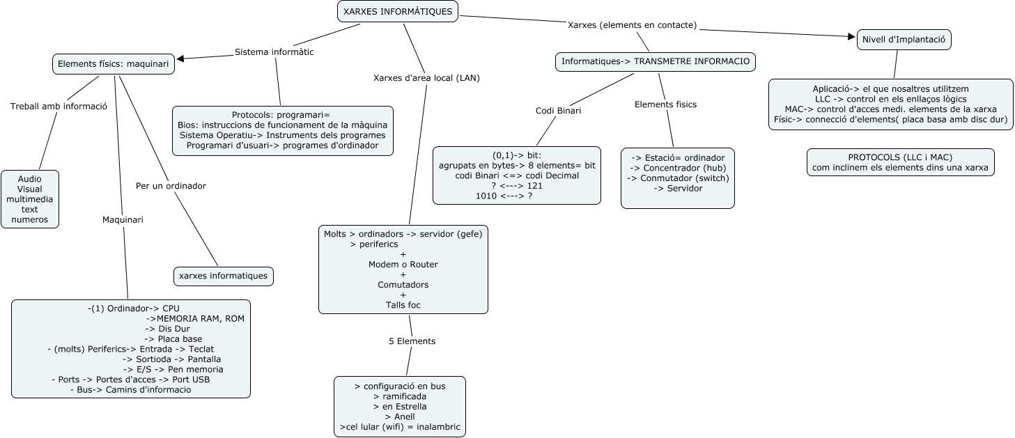 Este Cmap, tiene información relacionada con: xarxes 22, Informatiques-> TRANSMETRE INFORMACIO Elements fisics -> Estació= ordinador -> Concentrador (hub) -> Conmutador (switch) -> Servidor, XARXES INFORMÀTIQUES Xarxes (elements en contacte) Informatiques-> TRANSMETRE INFORMACIO, XARXES INFORMÀTIQUES Xarxes d'area local (LAN) Molts > ordinadors -> servidor (gefe) > periferics + Modem o Router + Comutadors + Talls foc, XARXES INFORMÀTIQUES Xarxes (elements en contacte) Nivell d'Implantació, Elements físics: maquinari Maquinari -(1) Ordinador-> CPU ->MEMORIA RAM, ROM -> Dis Dur -> Placa base - (molts) Periferics-> Entrada -> Teclat -> Sortioda -> Pantalla -> E/S -> Pen memoria - Ports -> Portes d'acces -> Port USB - Bus-> Camins d'informacio, Informatiques-> TRANSMETRE INFORMACIO Codi Binari (0,1)-> bit: agrupats en bytes-> 8 elements= bit codi Binari <=> codi Decimal ? <---> 121 1010 <---> ?, Molts > ordinadors -> servidor (gefe) > periferics + Modem o Router + Comutadors + Talls foc 5 Elements > configuració en bus > ramificada > en Estrella > Anell >cel lular (wifi) = inalambric, XARXES INFORMÀTIQUES Sistema informàtic Elements físics: maquinari, XARXES INFORMÀTIQUES Sistema informàtic Protocols: programari= Bios: instruccions de funcionament de la màquina Sistema Operatiu-> Instruments dels programes Programari d'usuari-> programes d'ordinador, Aplicació-> el que nosaltres utilitzem LLC -> control en els enllaços lògics MAC-> control d'acces medi. elements de la xarxa Físic-> connecció d'elements( placa basa amb disc dur) ???? Nivell d'Implantació, Elements físics: maquinari Treball amb informació Audio Visual multimedia text numeros, Elements físics: maquinari Per un ordinador xarxes informatiques