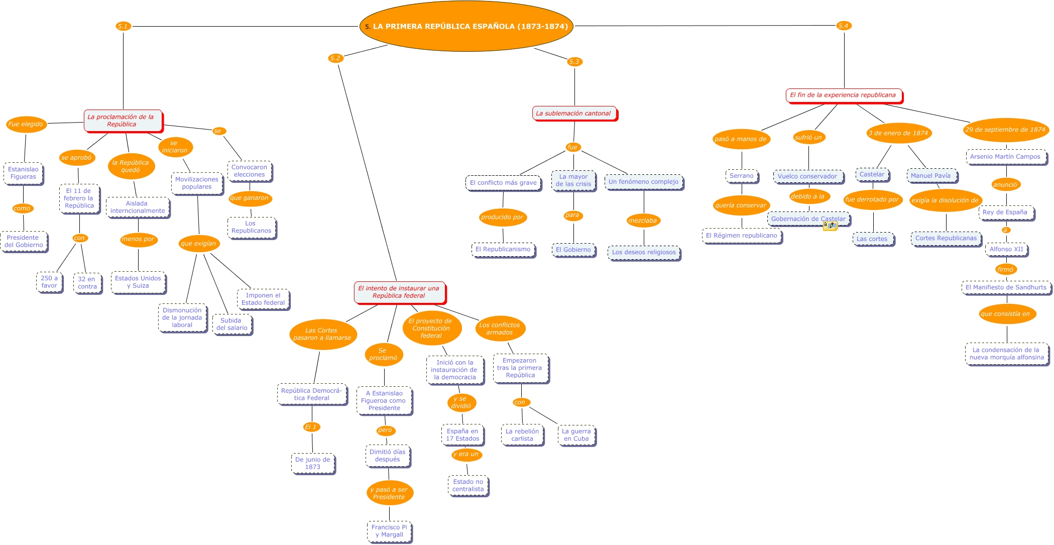 Este Cmap, tiene información relacionada con: punto 5, 5. LA PRIMERA REPÚBLICA ESPAÑOLA (1873-1874) 5.3 La sublemación cantonal, El Manifiesto de Sandhurts que consistía en La condensación de la nueva morquía alfonsina, La sublemación cantonal fue El conflicto más grave, La proclamación de la República la República quedó Aislada interncionalmente, Convocaron elecciones que ganaron Los Republicanos, El intento de instaurar una República federal Se proclamó A Estanislao Figueroa como Presidente, El fin de la experiencia republicana 29 de septiembre de 1874 Arsenio Martín Campos, El fin de la experiencia republicana 3 de enero de 1874 Castelar, Inició con la instauración de la democracia y se dividió España en 17 Estados, La mayor de las crisis para El Gobierno, Un fenómeno complejo mezclaba Los deseos religiosos, El 11 de febrero la República con 32 en contra, 5. LA PRIMERA REPÚBLICA ESPAÑOLA (1873-1874) 5.1 La proclamación de la República, El conflicto más grave producido por El Republicanismo, El intento de instaurar una República federal El proyecto de Constitución federal Inició con la instauración de la democracia, Alfonso XII firmó El Manifiesto de Sandhurts, Vuelco conservador debido a la Gobernación de Castelar, Empezaron tras la primera República con La guerra en Cuba, La sublemación cantonal fue Un fenómeno complejo, 5. LA PRIMERA REPÚBLICA ESPAÑOLA (1873-1874) 5.2 El intento de instaurar una República federal