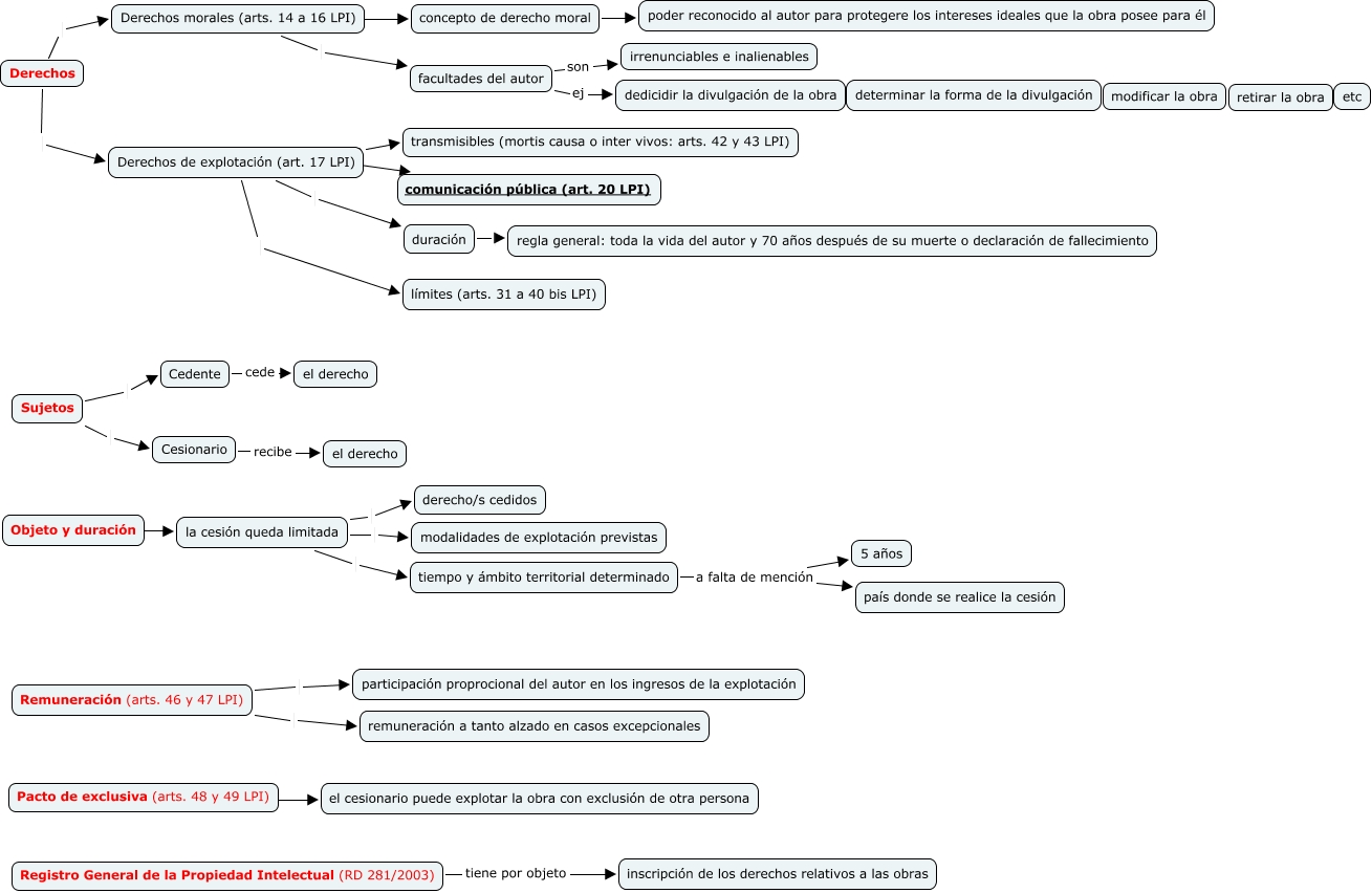 Este Cmap, tiene información relacionada con: contrato cesión derecho comunicación pública, la cesión queda limitada modalidades de explotación previstas, Sujetos Cedente, Derechos Derechos morales (arts. 14 a 16 LPI), Derechos de explotación (art. 17 LPI) ???? comunicación pública (art. 20 LPI), Registro General de la Propiedad Intelectual (RD 281/2003) tiene por objeto inscripción de los derechos relativos a las obras, tiempo y ámbito territorial determinado a falta de mención 5 años, facultades del autor ej dedicidir la divulgación de la obra, la cesión queda limitada derecho/s cedidos, duración regla general: toda la vida del autor y 70 años después de su muerte o declaración de fallecimiento, Derechos Derechos de explotación (art. 17 LPI), Derechos de explotación (art. 17 LPI) duración, Pacto de exclusiva (arts. 48 y 49 LPI) ???? el cesionario puede explotar la obra con exclusión de otra persona, Derechos morales (arts. 14 a 16 LPI) facultades del autor, Objeto y duración la cesión queda limitada, Cesionario recibe el derecho, tiempo y ámbito territorial determinado a falta de mención país donde se realice la cesión, Remuneración (arts. 46 y 47 LPI) participación proprocional del autor en los ingresos de la explotación, concepto de derecho moral ???? poder reconocido al autor para protegere los intereses ideales que la obra posee para él, Derechos de explotación (art. 17 LPI) ???? transmisibles (mortis causa o inter vivos: arts. 42 y 43 LPI), Derechos de explotación (art. 17 LPI) límites (arts. 31 a 40 bis LPI)