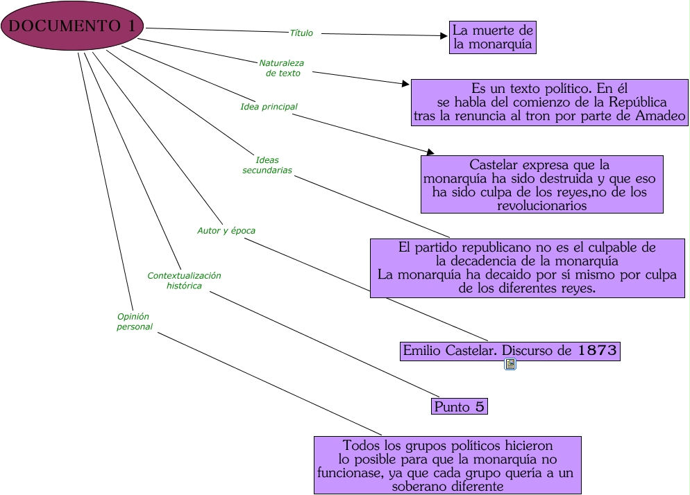Este Cmap, tiene información relacionada con: documento 1, DOCUMENTO 1 Título La muerte de la monarquía, DOCUMENTO 1 Opinión personal Todos los grupos políticos hicieron lo posible para que la monarquía no funcionase, ya que cada grupo quería a un soberano diferente, DOCUMENTO 1 Ideas secundarias El partido republicano no es el culpable de la decadencia de la monarquía La monarquía ha decaido por sí mismo por culpa de los diferentes reyes., DOCUMENTO 1 Naturaleza de texto Es un texto político. En él se habla del comienzo de la República tras la renuncia al tron por parte de Amadeo, DOCUMENTO 1 Idea principal Castelar expresa que la monarquía ha sido destruida y que eso ha sido culpa de los reyes,no de los revolucionarios, DOCUMENTO 1 Contextualización histórica Punto 5, DOCUMENTO 1 Autor y época Emilio Castelar. Discurso de 1873