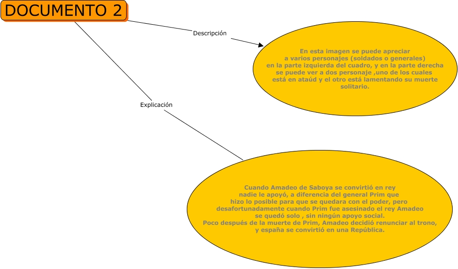 Este Cmap, tiene información relacionada con: Documento 2, DOCUMENTO 2 Descripción En esta imagen se puede apreciar a varios personajes (soldados o generales) en la parte izquierda del cuadro, y en la parte derecha se puede ver a dos personaje ,uno de los cuales está en ataúd y el otro está lamentando su muerte solitario., DOCUMENTO 2 Explicación Cuando Amadeo de Saboya se convirtió en rey nadie le apoyó, a diferencia del general Prim que hizo lo posible para que se quedara con el poder, pero desafortunadamente cuando Prim fue asesinado el rey Amadeo se quedó solo , sin ningún apoyo social. Poco después de la muerte de Prim, Amadeo decidió renunciar al trono, y españa se convirtió en una República.