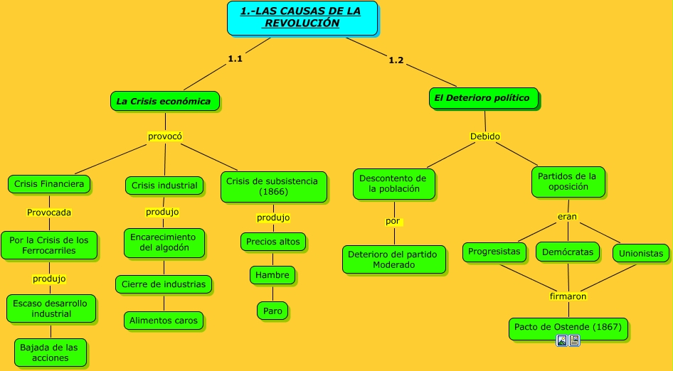 Este Cmap, tiene información relacionada con: 1, Partidos de la oposición eran Progresistas, Crisis industrial provocó Crisis Financiera, Crisis industrial provocó Crisis de subsistencia (1866), El Deterioro político Debido Partidos de la oposición, 1.-LAS CAUSAS DE LA REVOLUCIÓN 1.1 La Crisis económica, Crisis de subsistencia (1866) produjo Precios altos, Demócratas firmaron Pacto de Ostende (1867), Por la Crisis de los Ferrocarriles produjo Escaso desarrollo industrial, El Deterioro político Debido Descontento de la población, Crisis industrial provocó La Crisis económica, Crisis industrial produjo Encarecimiento del algodón, Bajada de las acciones ???? Escaso desarrollo industrial, Cierre de industrias ???? Alimentos caros, 1.-LAS CAUSAS DE LA REVOLUCIÓN 1.2 El Deterioro político, Partidos de la oposición eran Unionistas, Precios altos ???? Hambre, Descontento de la población por Deterioro del partido Moderado, Hambre ???? Paro, Partidos de la oposición eran Demócratas, Crisis Financiera Provocada Por la Crisis de los Ferrocarriles