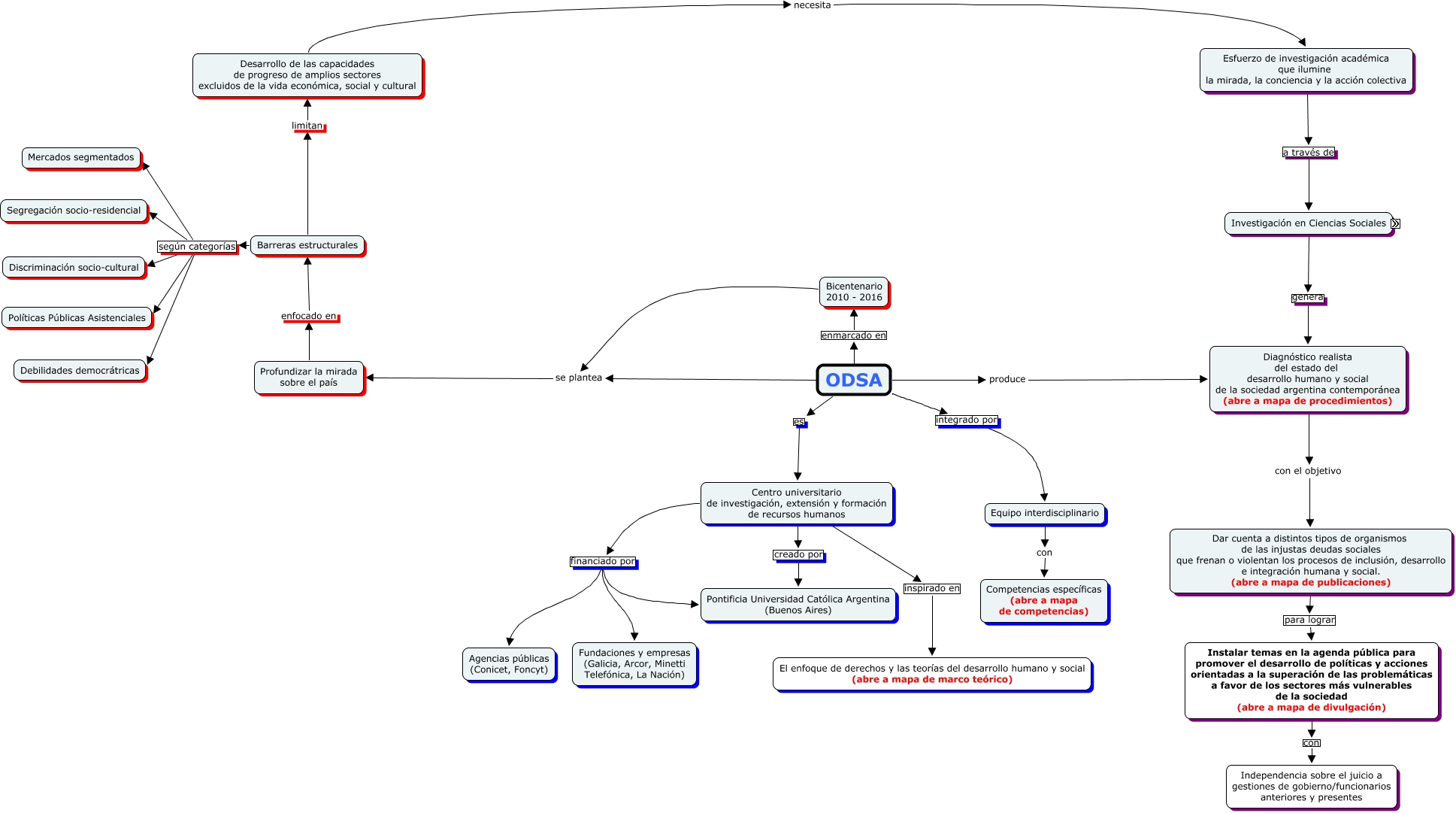 Este Cmap, tiene información relacionada con: ODSA_Sobrevolando_20111128, Instalar temas en la agenda pública para promover el desarrollo de políticas y acciones orientadas a la superación de las problemáticas a favor de los sectores más vulnerables de la sociedad (abre a mapa de divulgación) con Independencia sobre el juicio a gestiones de gobierno/funcionarios anteriores y presentes, Dar cuenta a distintos tipos de organismos de las injustas deudas sociales que frenan o violentan los procesos de inclusión, desarrollo e integración humana y social. (abre a mapa de publicaciones) para lograr Instalar temas en la agenda pública para promover el desarrollo de políticas y acciones orientadas a la superación de las problemáticas a favor de los sectores más vulnerables de la sociedad (abre a mapa de divulgación), Centro universitario de investigación, extensión y formación de recursos humanos financiado por Pontificia Universidad Católica Argentina (Buenos Aires), Barreras estructurales según categorías Mercados segmentados, Encuadre teórico hace descifrable Sentido del conocimiento generado, Centro universitario de investigación, extensión y formación de recursos humanos financiado por Fundaciones y empresas (Galicia, Arcor, Minetti Telefónica, La Nación), Investigación en Ciencias Sociales genera Diagnóstico realista del estado del desarrollo humano y social de la sociedad argentina contemporánea (abre a mapa de procedimientos), Centro universitario de investigación, extensión y formación de recursos humanos financiado por Agencias públicas (Conicet, Foncyt), Encuadre metodológico hace descifrable La información, Encuadre metodológico hace descifrable Sentido del conocimiento generado, Concepción ética hace descifrable La información, Barreras estructurales según categorías Políticas Públicas Asistenciales, ODSA integrado por Equipo interdisciplinario, Profundizar la mirada sobre el país enfocado en Barreras estructurales, Esfuerzo de investigación académica que ilumine la mirada, la conciencia y la acción colectiva a través de Investigación en Ciencias Sociales, Centro universitario de investigación, extensión y formación de recursos humanos creado por Pontificia Universidad Católica Argentina (Buenos Aires), Modos de elaborar inferencias válidas acerca de la realidad hace descifrable La información, Barreras estructurales según categorías Debilidades democrátricas, ODSA se plantea Profundizar la mirada sobre el país, Modos de elaborar inferencias válidas acerca de la realidad hace descifrable Sentido del conocimiento generado