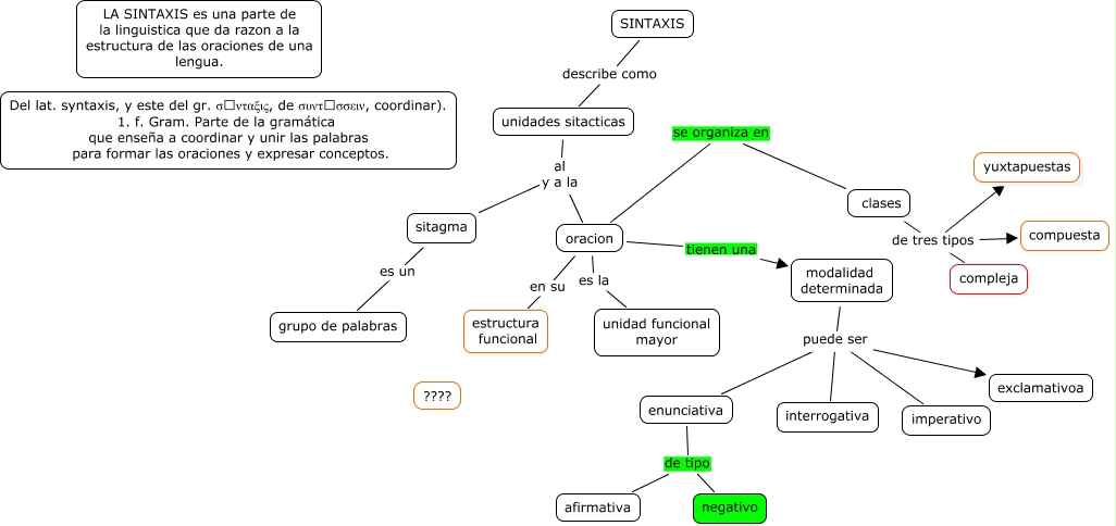 Este Cmap, tiene información relacionada con: sintaxis, modalidad determinada puede ser imperativo, clases de tres tipos compleja, oracion tienen una modalidad determinada, modalidad determinada puede ser exclamativoa, unidades sitacticas al y a la sitagma, unidades sitacticas al y a la oracion, oracion se organiza en clases, clases de tres tipos compuesta, oracion en su estructura funcional, SINTAXIS describe como unidades sitacticas, clases de tres tipos yuxtapuestas, sitagma es un grupo de palabras, modalidad determinada puede ser interrogativa, enunciativa de tipo afirmativa, modalidad determinada puede ser enunciativa, oracion es la unidad funcional mayor, enunciativa de tipo negativo