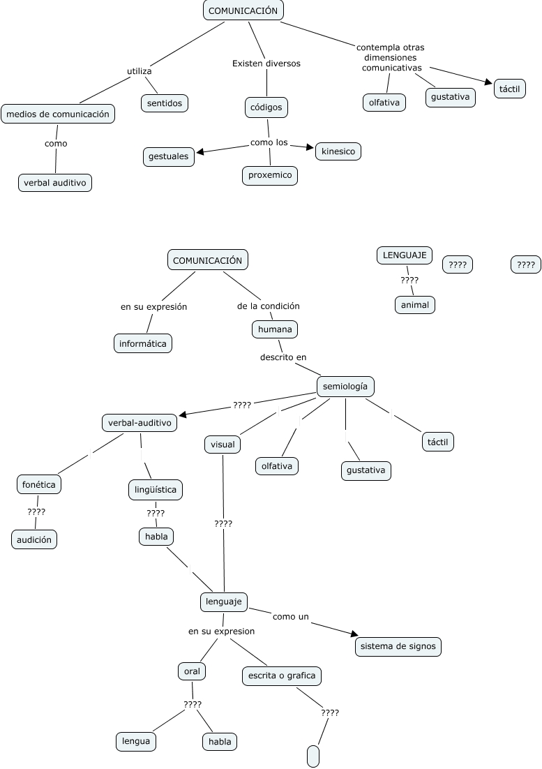 Este Cmap, tiene información relacionada con: conceptos utilizados en investigacion, semiología olfativa, COMUNICACIÓN utiliza sentidos, COMUNICACIÓN utiliza medios de comunicación, medios de comunicación como verbal auditivo, lingüística ???? habla, lenguaje en su expresion escrita o grafica, visual ???? lenguaje, COMUNICACIÓN contempla otras dimensiones comunicativas gustativa, oral ???? habla, semiología visual, semiología táctil, humana descrito en semiología, lenguaje como un sistema de signos, COMUNICACIÓN de la condición humana, COMUNICACIÓN Existen diversos códigos, lenguaje en su expresion oral, habla lenguaje, códigos como los gestuales, LENGUAJE ???? animal, COMUNICACIÓN contempla otras dimensiones comunicativas olfativa