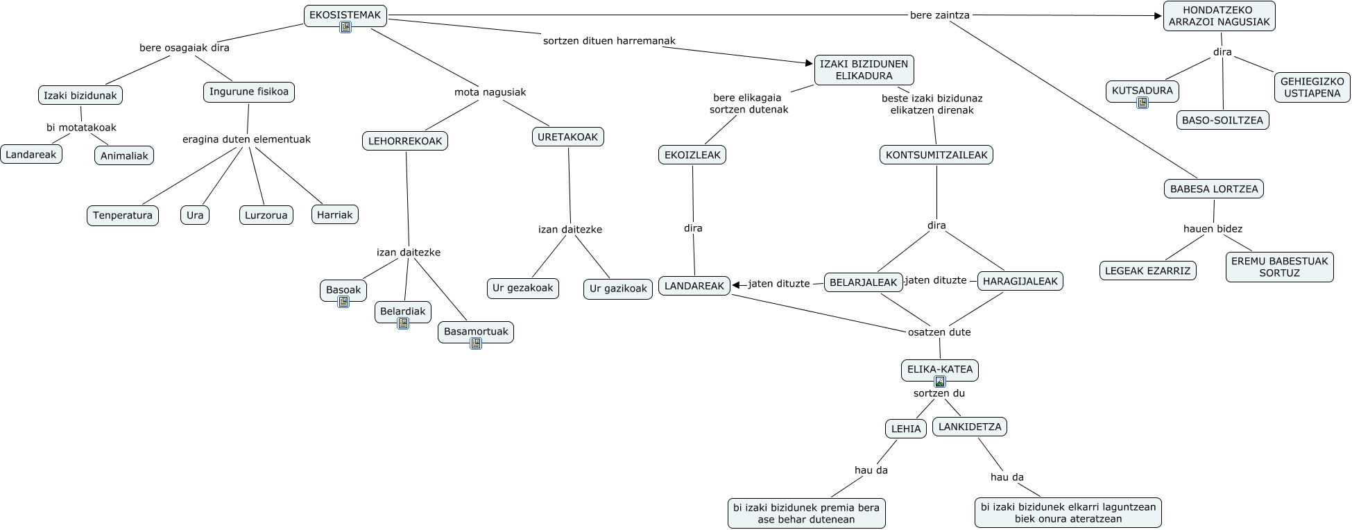 Este Cmap, tiene información relacionada con: Ekosistemak, EKOSISTEMAK bere osagaiak dira Ingurune fisikoa, LEHIA hau da bi izaki bizidunek premia bera ase behar dutenean, LANKIDETZA hau da bi izaki bizidunek elkarri laguntzean biek onura ateratzean, Izaki bizidunak bi motatakoak Animaliak, HONDATZEKO ARRAZOI NAGUSIAK dira KUTSADURA, HONDATZEKO ARRAZOI NAGUSIAK dira GEHIEGIZKO USTIAPENA, ELIKA-KATEA sortzen du LEHIA, EKOIZLEAK dira LANDAREAK, EKOSISTEMAK bere zaintza HONDATZEKO ARRAZOI NAGUSIAK, HARAGIJALEAK osatzen dute ELIKA-KATEA, KONTSUMITZAILEAK dira BELARJALEAK, Izaki bizidunak bi motatakoak Landareak, IZAKI BIZIDUNEN ELIKADURA bere elikagaia sortzen dutenak EKOIZLEAK, LEHORREKOAK izan daitezke Basamortuak, Ingurune fisikoa eragina duten elementuak Lurzorua, IZAKI BIZIDUNEN ELIKADURA beste izaki bizidunaz elikatzen direnak KONTSUMITZAILEAK, KONTSUMITZAILEAK dira HARAGIJALEAK, BELARJALEAK jaten dituzte LANDAREAK, EKOSISTEMAK sortzen dituen harremanak IZAKI BIZIDUNEN ELIKADURA, HARAGIJALEAK jaten dituzte BELARJALEAK
