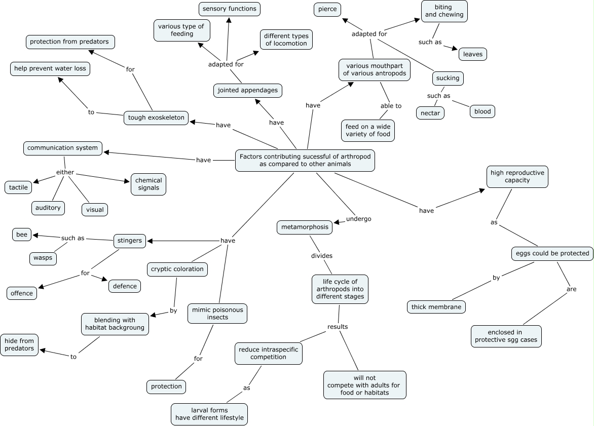 This Concept Map, created with IHMC CmapTools, has information related to: 11_tutorial1a, Factors contributing sucessful of arthropod as compared to other animals have cryptic coloration, Factors contributing sucessful of arthropod as compared to other animals have communication system, cryptic coloration by blending with habitat backgroung, communication system either auditory, various mouthpart of various antropods adapted for pierce, mimic poisonous insects for protection, Factors contributing sucessful of arthropod as compared to other animals have various mouthpart of various antropods, biting and chewing such as leaves, Factors contributing sucessful of arthropod as compared to other animals have mimic poisonous insects, life cycle of arthropods into different stages results will not compete with adults for food or habitats, communication system either tactile, blending with habitat backgroung to hide from predators, jointed appendages adapted for different types of locomotion, jointed appendages adapted for sensory functions, various mouthpart of various antropods able to feed on a wide variety of food, sucking such as nectar, life cycle of arthropods into different stages results reduce intraspecific competition, tough exoskeleton to help prevent water loss, stingers such as wasps, stingers such as bee