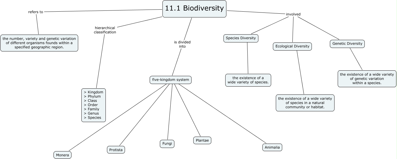 This Concept Map, created with IHMC CmapTools, has information related to: 11.0_Biodiversity_Farah.cmap, five-kingdom system ???? Monera, 11.1 Biodiversity involved Ecological Diversity, five-kingdom system ???? Plantae, five-kingdom system ???? Fungi, five-kingdom system ???? Protista, 11.1 Biodiversity involved Species Diversity, Genetic Diversity ???? the existence of a wide variety of genetic variation within a species., Species Diversity ???? the existence of a wide variety of species., 11.1 Biodiversity hierarchical classification > Kingdom > Phylum > Class > Order > Family > Genus > Species, 11.1 Biodiversity refers to the number, variety and genetic variation of different organisms founds within a specified geographic region., 11.1 Biodiversity is divided into five-kingdom system, 11.1 Biodiversity involved Genetic Diversity, five-kingdom system ???? Animalia, Ecological Diversity ???? the existence of a wide variety of species in a natural community or habitat.