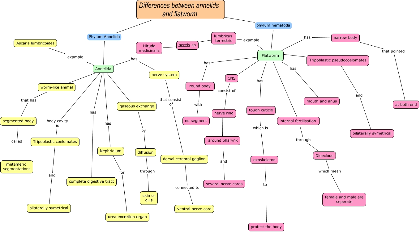 This Concept Map, created with IHMC CmapTools, has information related to: 11_tutorial(1b)_syuhada, Flatworm has narrow body, around pharynx and several nerve cords, Annelida example Ascaris lumbricoides, bilaterally symetrical and Tripoblastic pseudocoelomates, nerve ring around pharynx, internal fertilisation through Dioecious, Annelida body cavity is Tripoblastic coelomates, Annelida ???? gaseous exchange, Flatworm ???? CNS, Flatworm ???? internal fertilisation, CNS consist of nerve ring, Tripoblastic coelomates and bilaterally symetrical, Nephridium for urea excretion organ, Differences between annelids and flatworm Phylum Annelida Annelida, exoskeleton which is tough cuticle, Flatworm has round body, Dioecious which mean female and male are seperate, worm-like animal that has segmented body, narrow body that pointed at both end, nereis sp Hiruda medicinalis